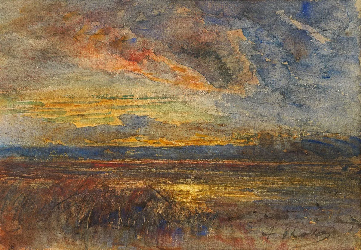 Upon his return to Lyons, he worked in the surrounding countryside, and met with artists such as Daubigny (q.v.) and Corot. In 1853 Ravier purchased a house in Crémieu, his home for the next fourteen years. He began to perfect his method: drawing in the morning and painting outdoors later in the afternoon. Contrary to the usual procedure, his smaller studies painted at the site served as a reference point for his watercolors, elaborated with the greatest care in the peace and quiet of the studio. These watercolors were highly sought after by the first admirers of Ravier's work.