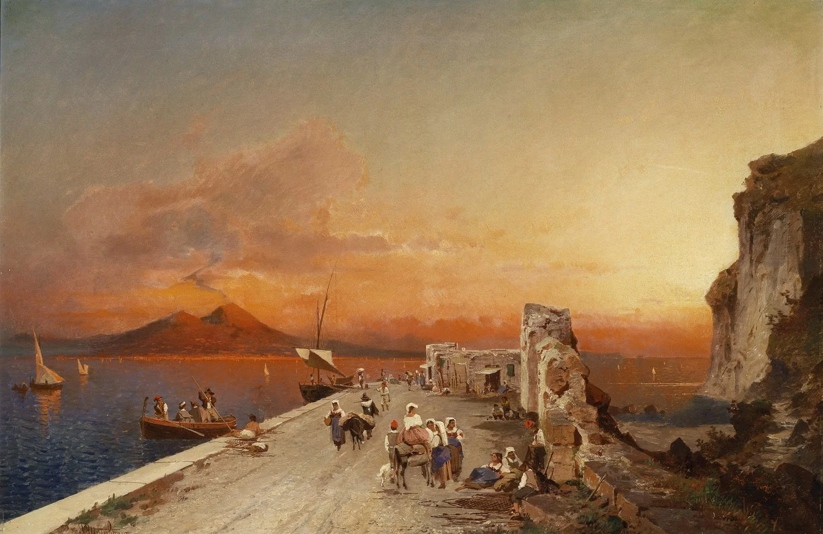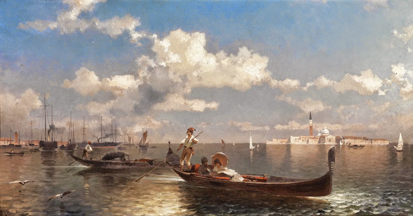Austrian painter Franz Richard Unterberger [1838-1902], a Romantic style painter of waterscapes, landscapes, architecture and Genre, was born in Innsbruck, in what was then the Austro-Hungarian Empire, on 15th August 1838, one of eleven children of a wealthy bourgeois family. He decided to pursue a career as an artist at a relatively young age and enrolled in the Academy in Munich. Here he studied with Albert Zimmerman [1808-1888] a professor and landscape painter at the Academy and with Julius Lange [1817-1878]. It was as a painter of Alpine landscapes that Unterberger first drew recognition, views particularly set in his native Tyrol. In 1860 Unterberger continued his studies in Düsseldorf; in what was to be a particularly significant period he was much taken by the work of Oswald Aschenbach [1827-1905] a landscape painter and his brother Andreas [1815-1910] also a landscape painter who worked extensively in Scandinavia before moving to Italy in the 1870’s.