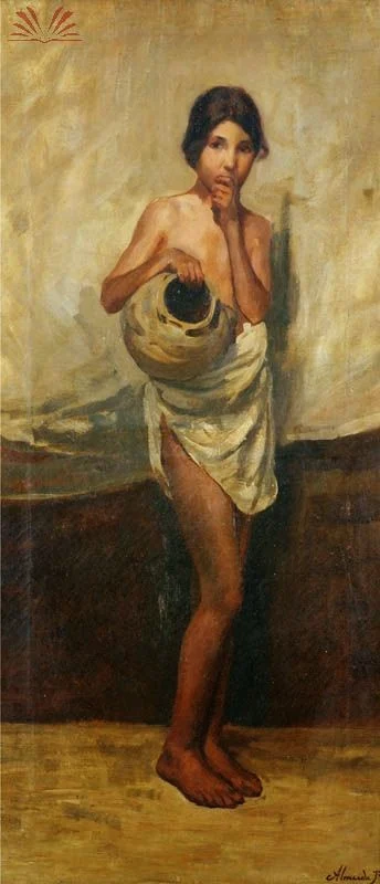 In 1876, the Emperor Peter II made a trip to Sao Paulo. There he saw the works of Almeida and was so impressed that he agreed to fund his trip to Europe for further studies. During March, the following year, a credit was opened at the Imperial House for 300 francs for the painter, who went to study in Paris in November. He enrolled there at the Ecole National Superieure des Beaux-Arts, where he distinguished himself in anatomical drawings and ornaments.