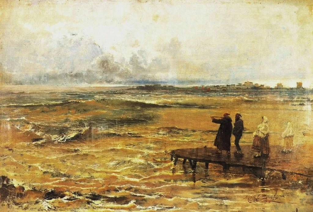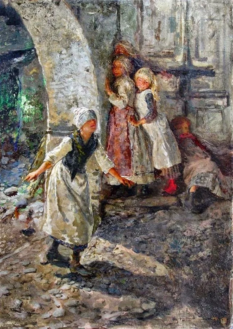 In 1887 Venice, he exhibited five canvases: Mascherata Chioggiotta; Laguna in burrasca; Chioggia; Parola di Dio, and Vaporino di Chioggia.