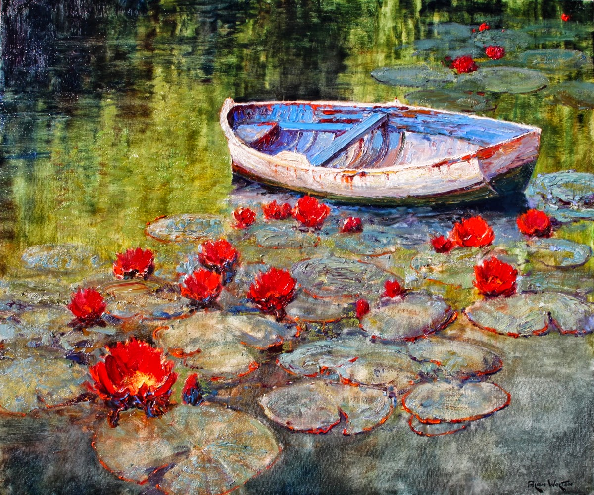 Mr Wolton likes to feel he can paint any subject, although today working largely in his American studio, he definitely has his favourite models. Water lily themes and studies of the canals of Venice, are at the present time, the artist feels, right at his finger tips.