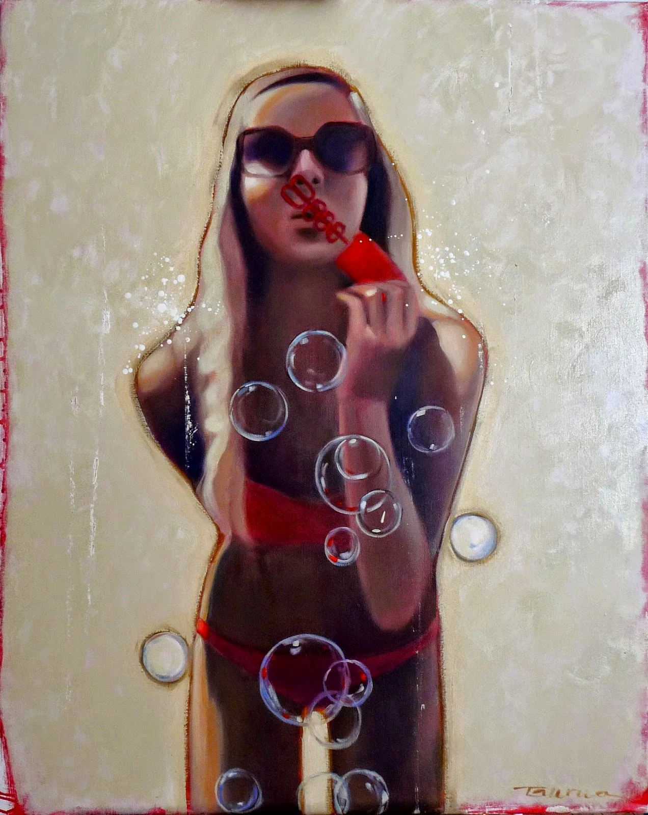 Taurua's paintings are as beautifully and as aggressively painted as they are sensually erotic. Her girls have a certain glamour that reminds her own life since she has been Miss France 1978 at the age of 18. Her palettes are so lush and vibrant that often you might find yourself getting lost in their smooth ungulations against his heavily textured and gessoed canvases.