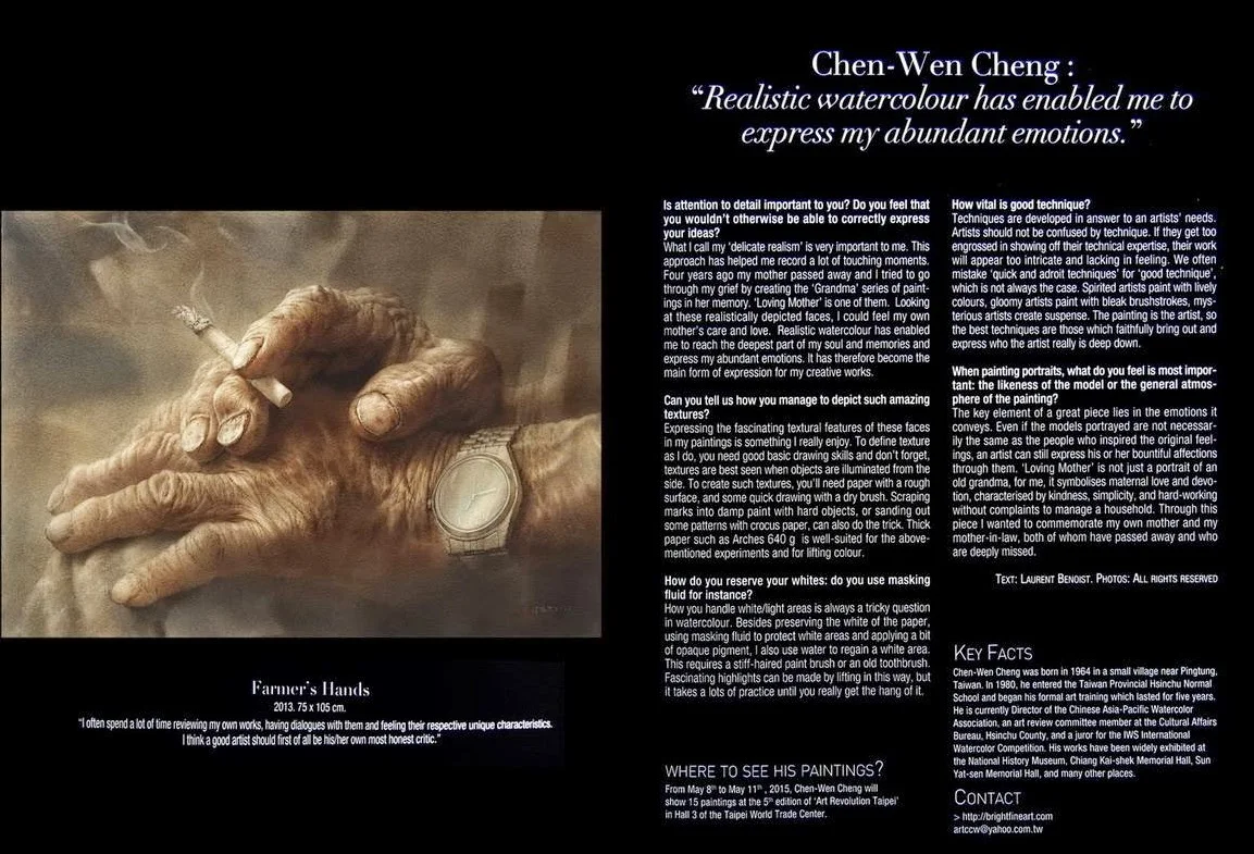 In 2014, Mr. Chen-Wen Cheng become finalist of World Watercolor Competition (France) and Winner of Golden Prize for his masterpiece "Loving Mother".