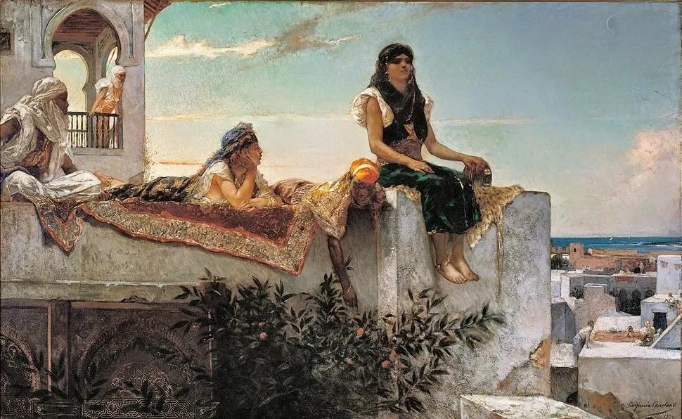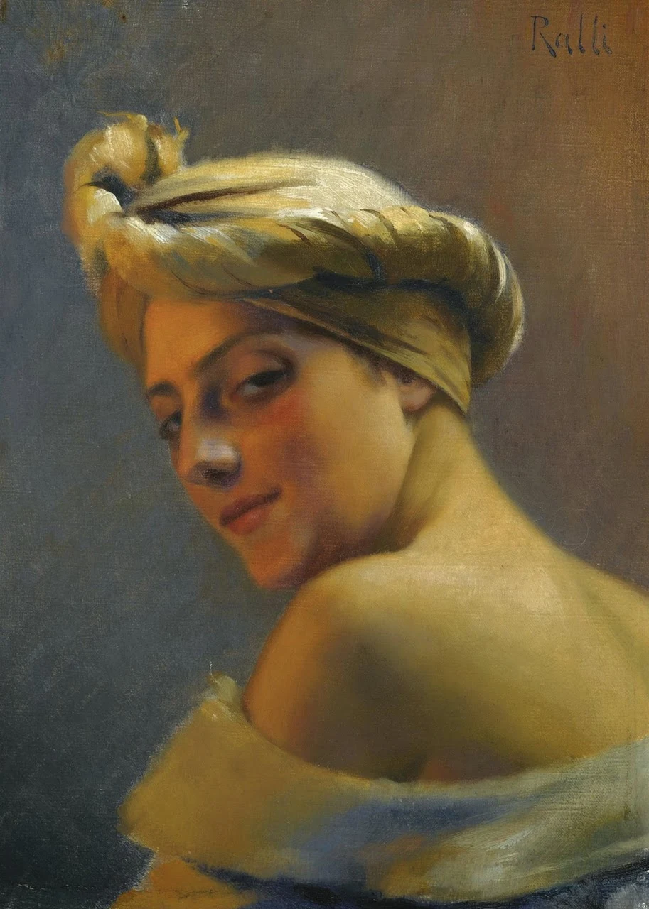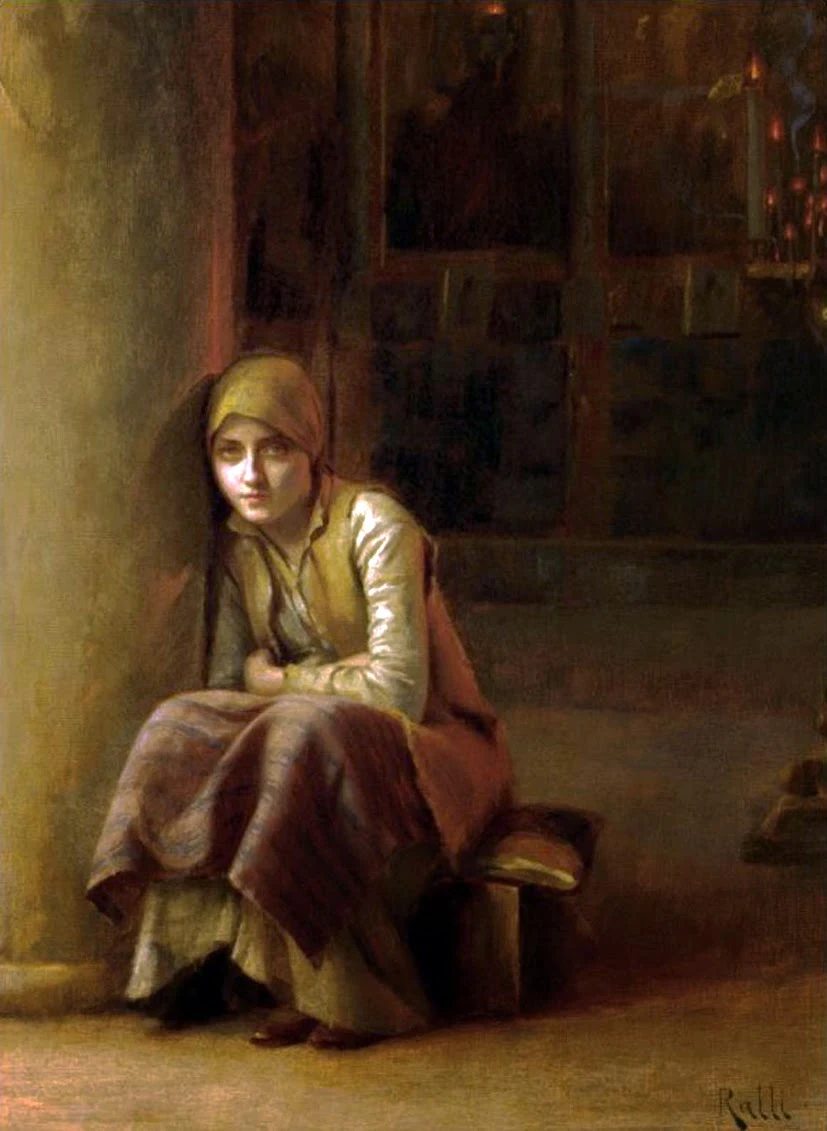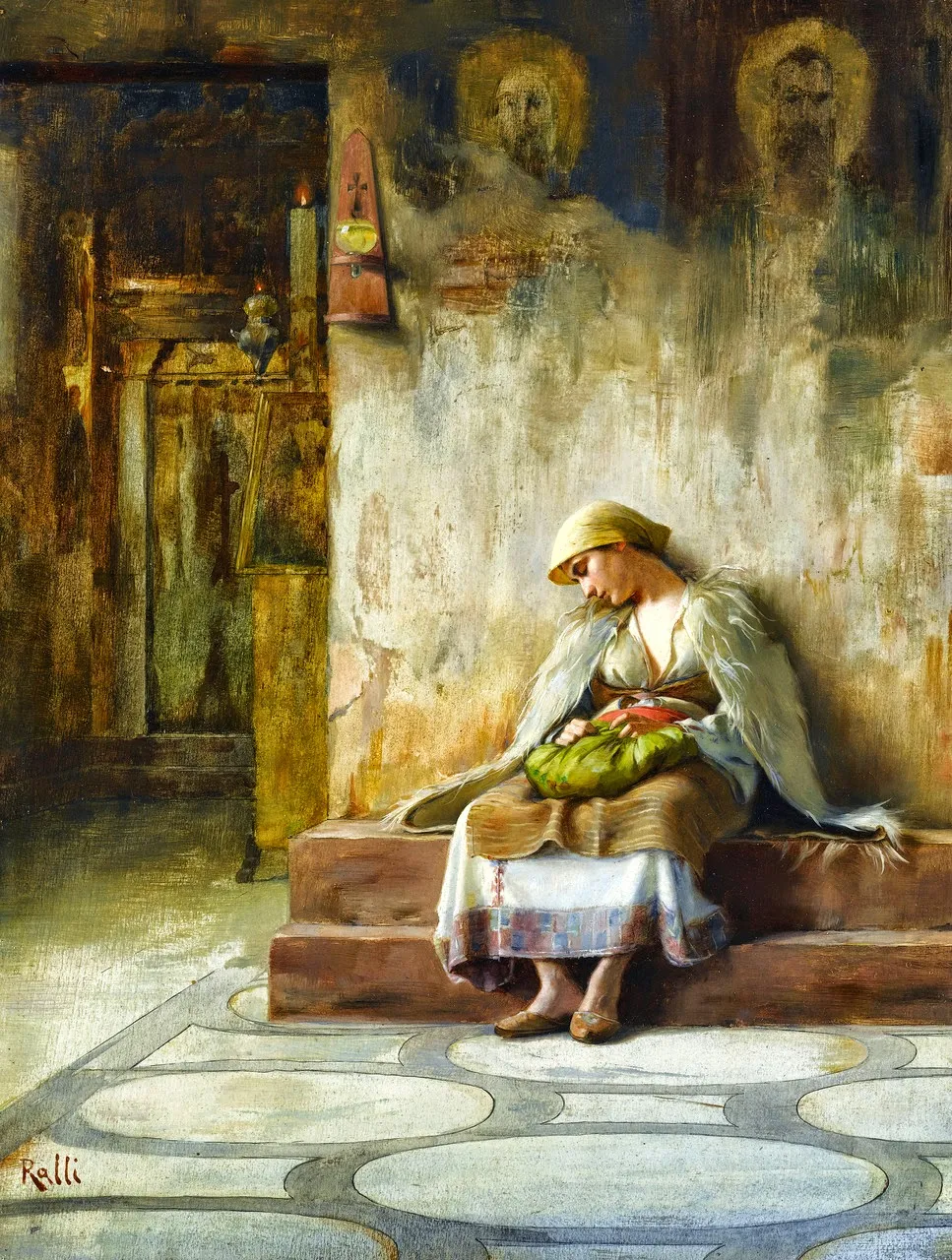 Ralli then travelled widely in North Africa and the Middle East, settling for a while in Cairo, Egypt. Here he found his inspiration for the romantic mysticism and suggestive sensuality of his many orientalistic paintings. His other genre paintings were often nostalgic recollections of the life and customs of his Greek homeland, which he portrayed with a delicate and moving reverence.