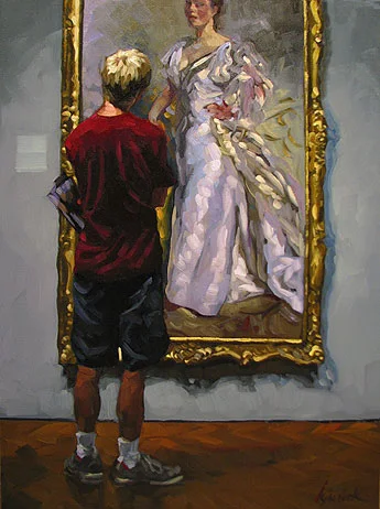 Today, Karin enjoys working as an artist full-time, and she simply heads over to the studio in her backyard, looks through her photographs, and begins. Even though she finds most of the inspiration for her realistic oil paintings from the photographs she takes, not too much has changed from that people-watching teenage girl with sketchbook in-hand.