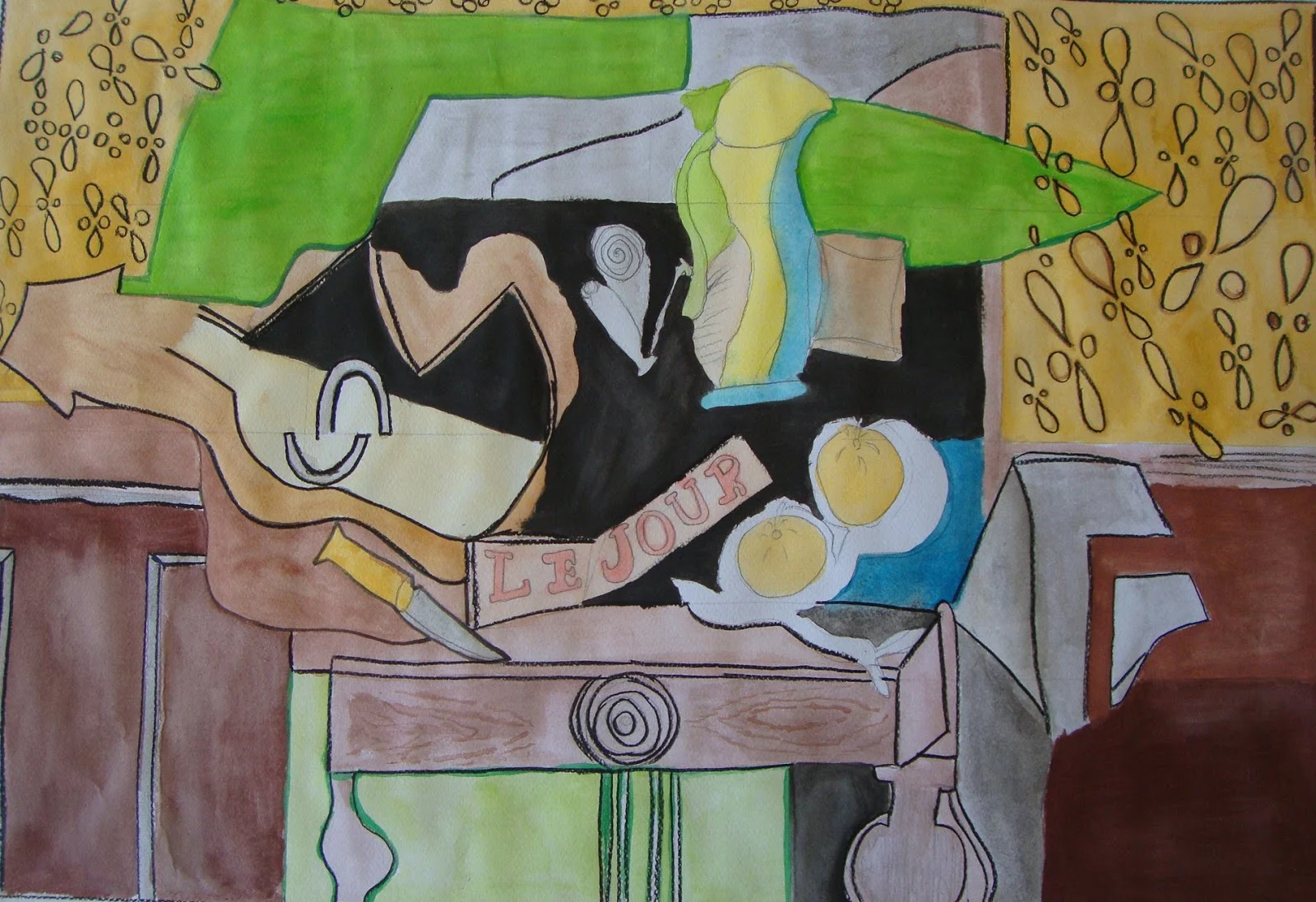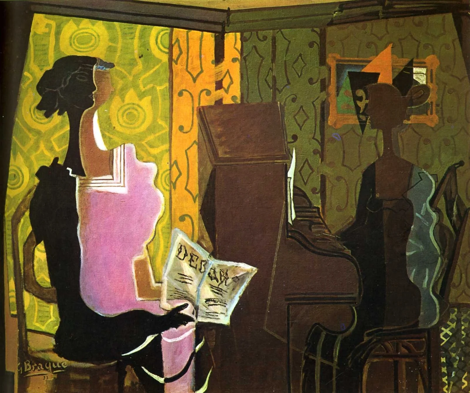 Braque’s Man with a Guitar is an example: the colours are brown, gray, and green, the pictorial space is almost flat, viewpoints and light sources are multiplied, contours are broken, volumes are often transparent, and facets are turned into apparently illogical simultaneous views.