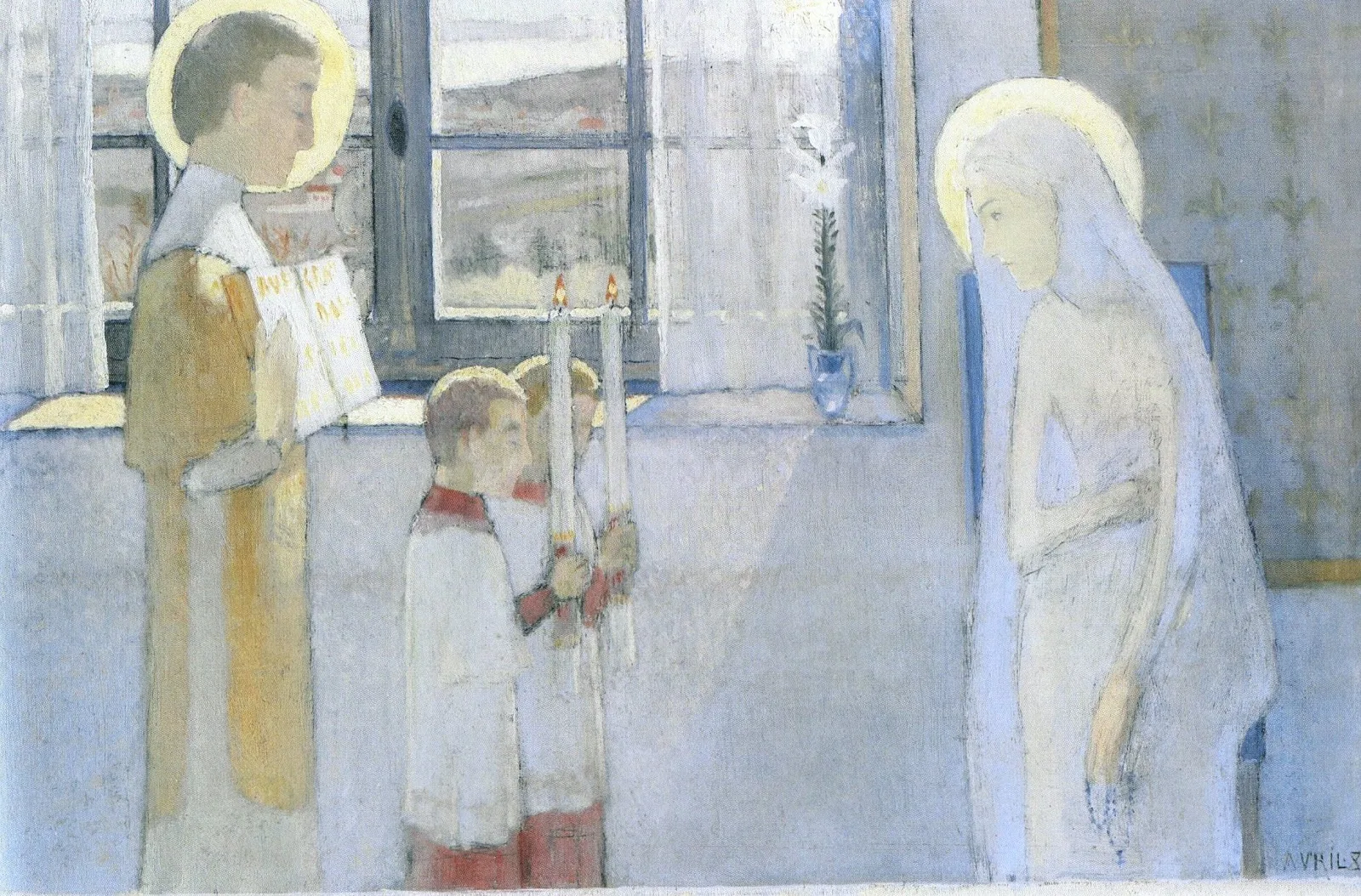 Denis frequently used to recount the origins of the Nabi movement, created in the aftermath of the furore provoked by the Talisman (Paris, Musée d'Orsay, former Maurice Denis collection), a small landscape with an emblematic title painted by Sérusier under the guidance of Gauguin. Along with Puvis de Chavanne, Fra Angelico and the Ingrists, Sérusier was a seminal figure for the young Denis. Like his Nabi friends, Denis produced more and more small paintings, each more audacious in its application of the new aesthetic: flat surfaces of bright colour, a radical simplification of shapes, absence of perspective, Japanism and Synthetism.