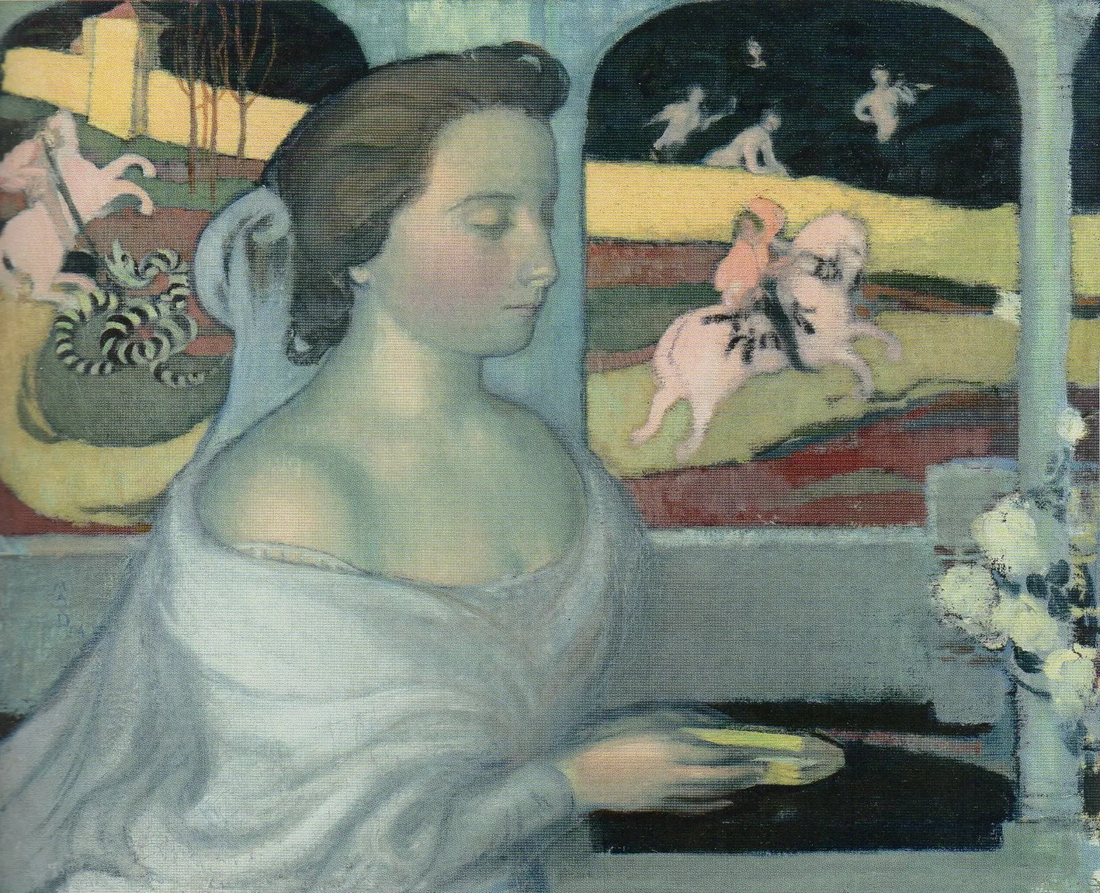The young woman’s features can be seen in the girls moving along the highly stylised path of life, in solemn processions. These accomplished, reverential and carefully considered paintings were bought by musicians, artists and collectors of the avant-garde symbolists.