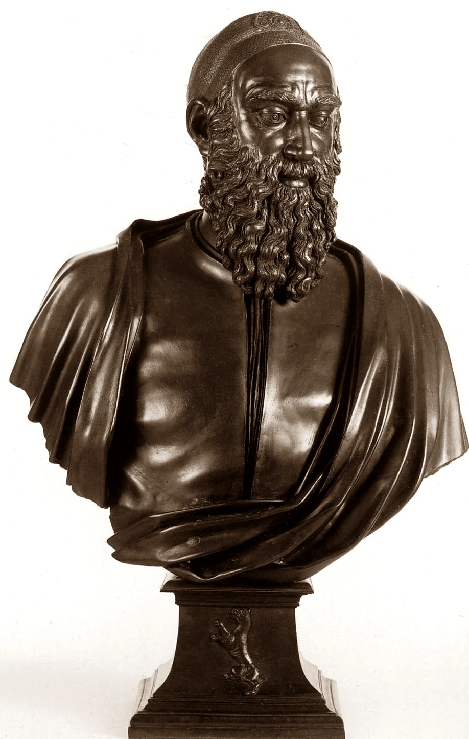 Fleeing to Venice in 1546 to escape charges of immorality, Cellini completed the bust by 1548. In the same period he restored an antique torso from Palestrina as Ganymede (1546-47; Uffizi, Florence) and carved his marble figures of Apollo and Hyacinth (1546) and of Narcissus (1546-47); all three works are now in the Bargello in Florence, as is a small relief of a greyhound made as a trial cast for the Perseus (1545).