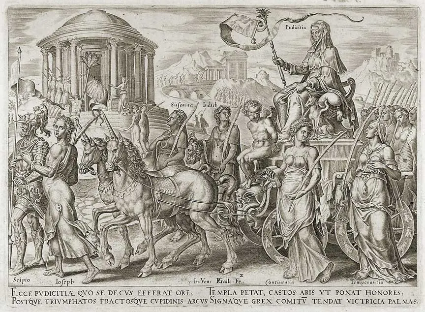 Seven Wonders of the Ancient World are depicted as a background for the abduction of Helen by Paris