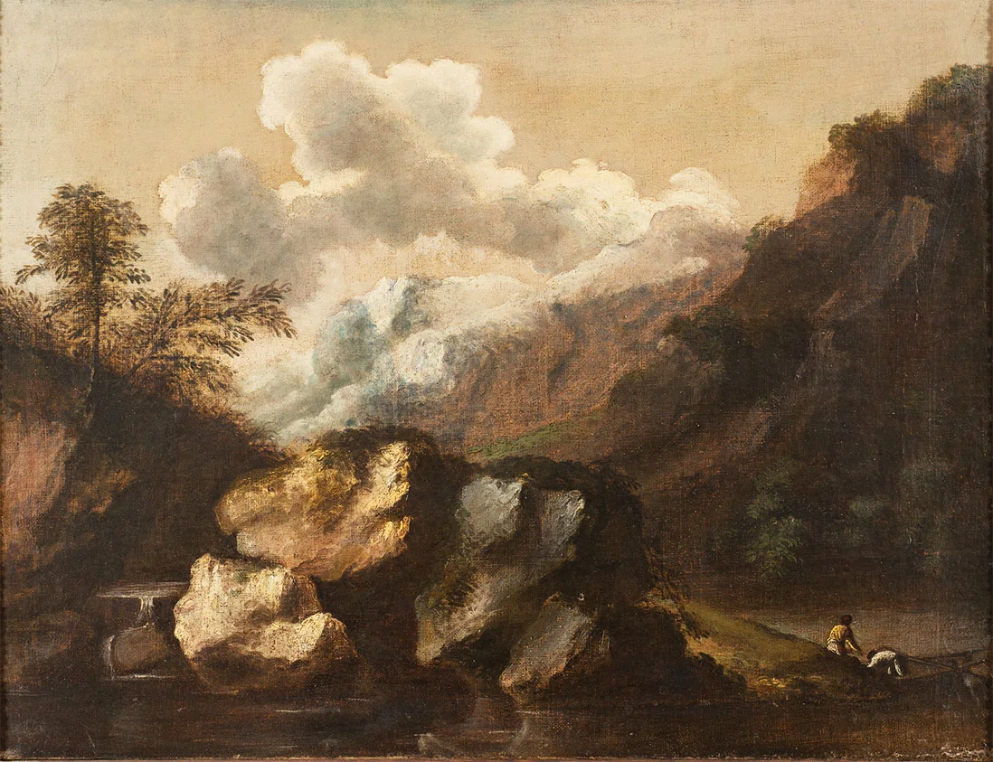Rosa was among the first to paint "romantic" landscapes, with a special turn for scenes of picturesque, often turbulent and rugged scenes peopled with shepherds, brigands, seamen, soldiers.