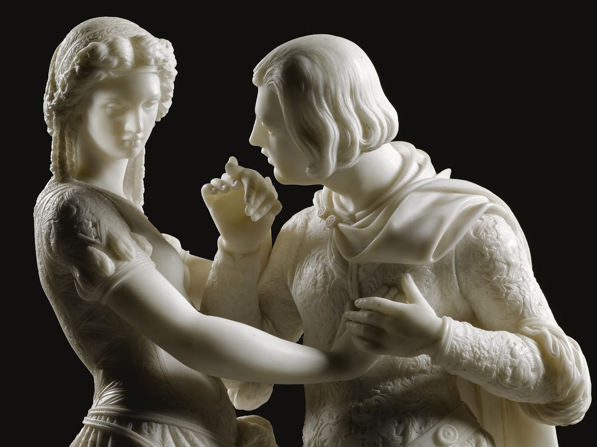In the present sculpture, Pio Fedi (1816-1892) presents us with an image of the courtship of Dianora. Ippolito's gently persuasive gesture conveys his intense and immediate affection for Dianora, whilst her apparent reticence highlights the agonistic relationship between their two families and the difficulties associated with their union. Pio Fedi's training as a goldsmith and engraver is evident in the virtuoso carving of the rich fabrics and differing surfaces. The intricacy of the carving, together with the small scale of the group, lends to it a precious, jewel-like quality. The signature compares closely with that of Pio Fedi's Il sospetto in the Ashmoleon, also dated 1872, and which, according to Nicholas Penny, may have been sculpted as a special piece by Pio Fedi himself.