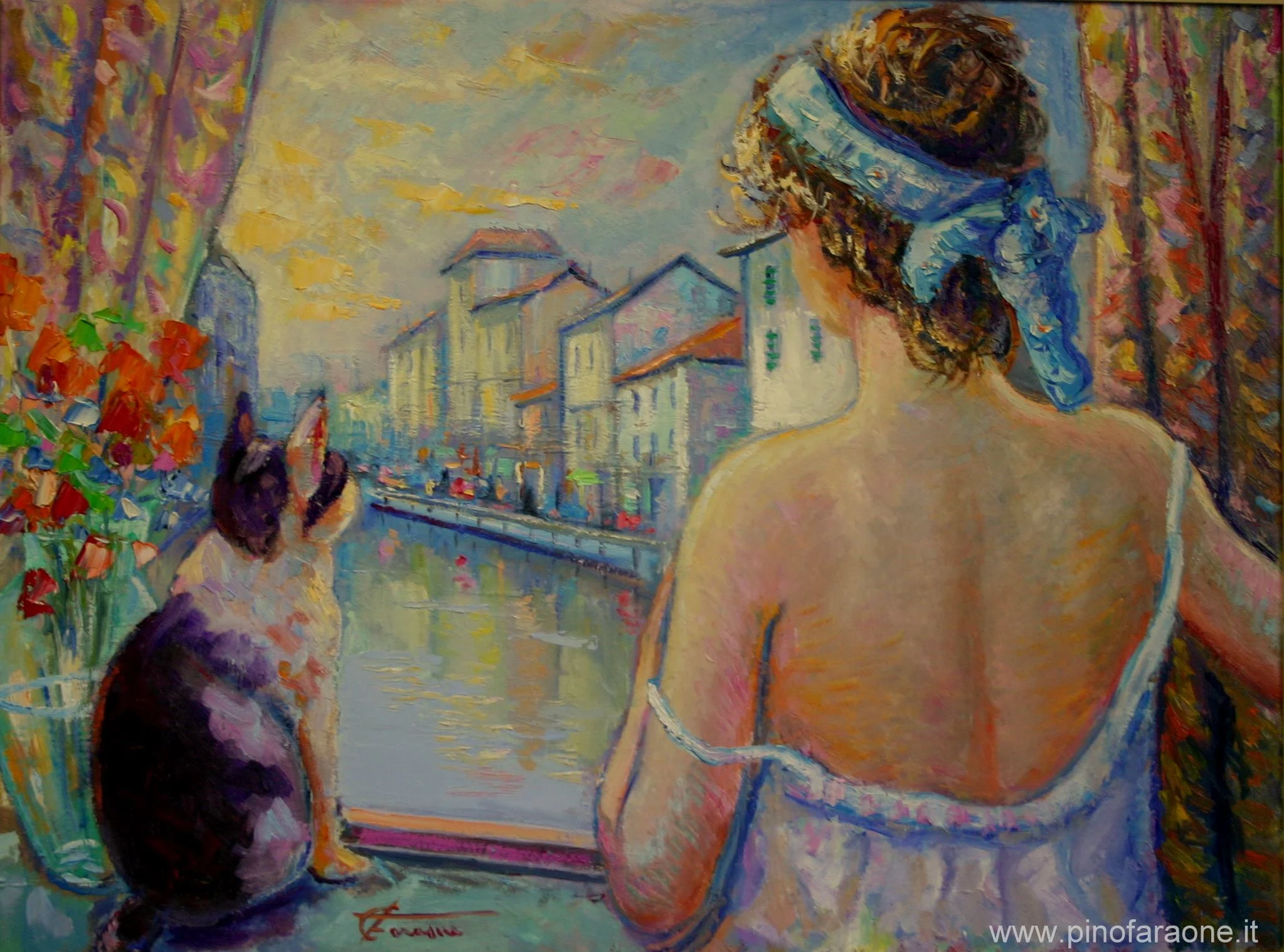 L’acqua è l’elemento onnipresente, sia che scorra nei navigli, sia che bagni le vie della città conferendo una serie di riflessi che l’artista ci restituisce conferendo alla scena ritmi cromatici di particolare intensità.