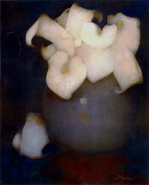 He is sometimes categorized as a symbolic realist, though Carel Peeters notes that the abstract qualities of Mankes's work remove him from both symbolism and realism. When working with oil-paints he was able to bring a kind of transparency to the paint especially when he was working with white, which acquired a pearly lustre because of his soft brush strokes. In self-portraits, observers noted, this gave his white skin a rather sickly appearance.