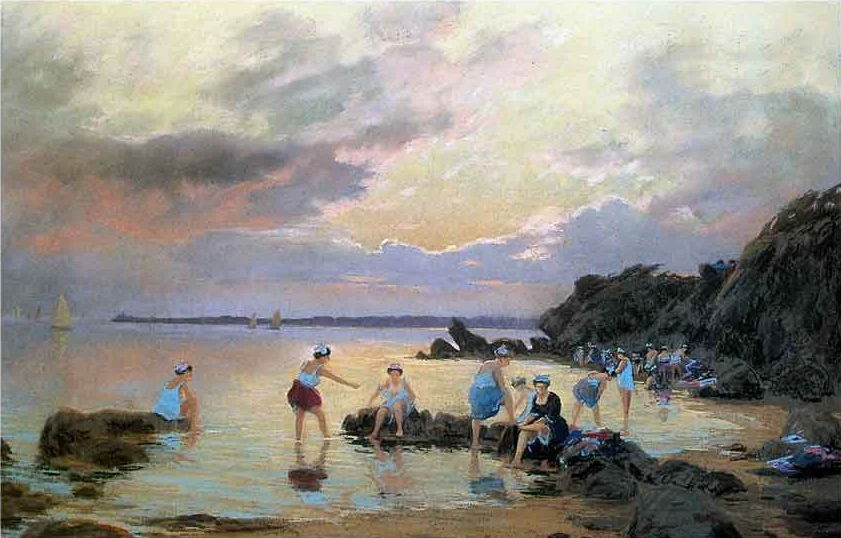 He chose pastel or watercolor, better able to restore transparency of the atmosphere and the vagaries of Breton’s skies. He nevertheless prefers to landscape, the evocation of local life, the marketplace of course, subject amply addressed by all painters, but also some scenes more original, less folk, less conventional. So these women turned in a skirt, which seeks freshness under a stormy sky: audacity shy of a painter who will always abide by the taste of the time, that of a middle class which seeks above all picturesque works, which bill certifies the artist, if not talent, at least the trade.