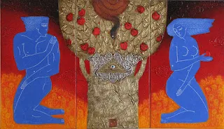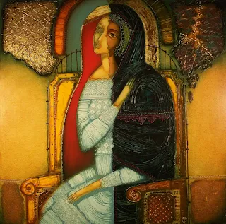 He works mainly on canvas with oil paint, mixed techniques or pencils. However he also uses watercolor, pastels and acrylics. With the help of a spatula, he mixes the materials in order to get the wished deepness, thickness and effect. His paintings are figurative with a stylized and decorative style.