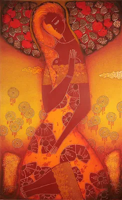 I suoi dipinti sono figurativi con uno stile stilizzato e decorativo.