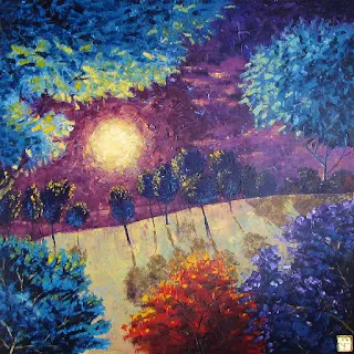 Tuttavia usa anche acquerelli, pastelli e acrilici. Con l'aiuto di una spatola mescola i materiali in modo da ottenere la profondità, lo spessore e l'effetto desiderato.