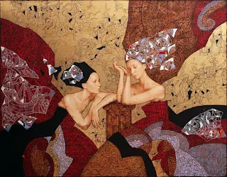 The peculiarity of the technic of the artists is a unique technology of preparation of the canvas with the application of several layers of colors and wax, use of gold leafs and combinftion of acrylic and oil painting". | AG Savitsky, art critic