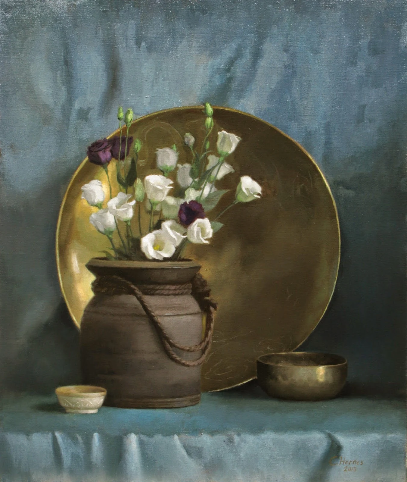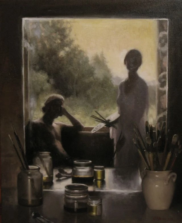 Currently, Cornelia is progressing with several projects simultaneously. She is alternating between two landscapes and two thematic large scale pieces intermixed with several still lives. In addition to allowing each layer of paint to throughly dry, from a technical standpoint, this also allows her a fresh perspective on her projects as they move forward.
