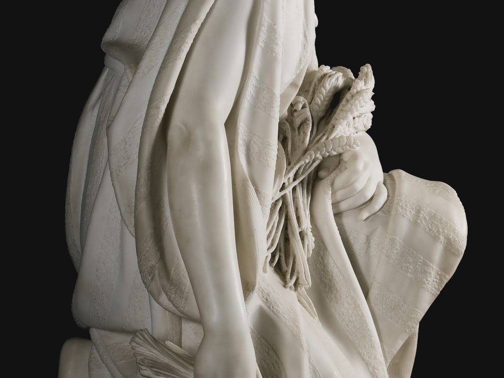 Ruth was a popular subject among 19th-century sculptors active in Italy, notably Giovanni Battista Lombardi and the American Randolph Rogers, whose famous depiction of the gleaning heroine is in the Metropolitan Museum of Art (inv. no. 99.7.1). Romanelli’s model precedes those by Lombardi and Rogers, having been exhibited in Paris in 1851. It is this Ruth who arguably best conveys the character’s piety and modesty. Despite some baring of flesh, her figure is largely covered by her historic garments and, in her kneeling position with sheafs of wheat in both hands, Ruth is believably caught in the act of her physically demanding work. Her romantic relationship with Boaz is hinted at through the longing upwards gaze. The present marble exhibits Romanelli’s attention to detail in the highly realistic carving of the wheat and the beautifully modelled hair and headdress. | © Sotheby’s