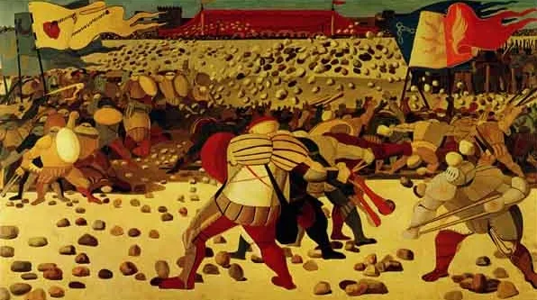 Fiume completed ten large paintings inspired from Italian Quattrocento masters like Piero della Francesca and Paolo Uccello. This cycle is now in the Sala Fiume at Palazzo Donini in Perugia, the head office of the Umbria Region.