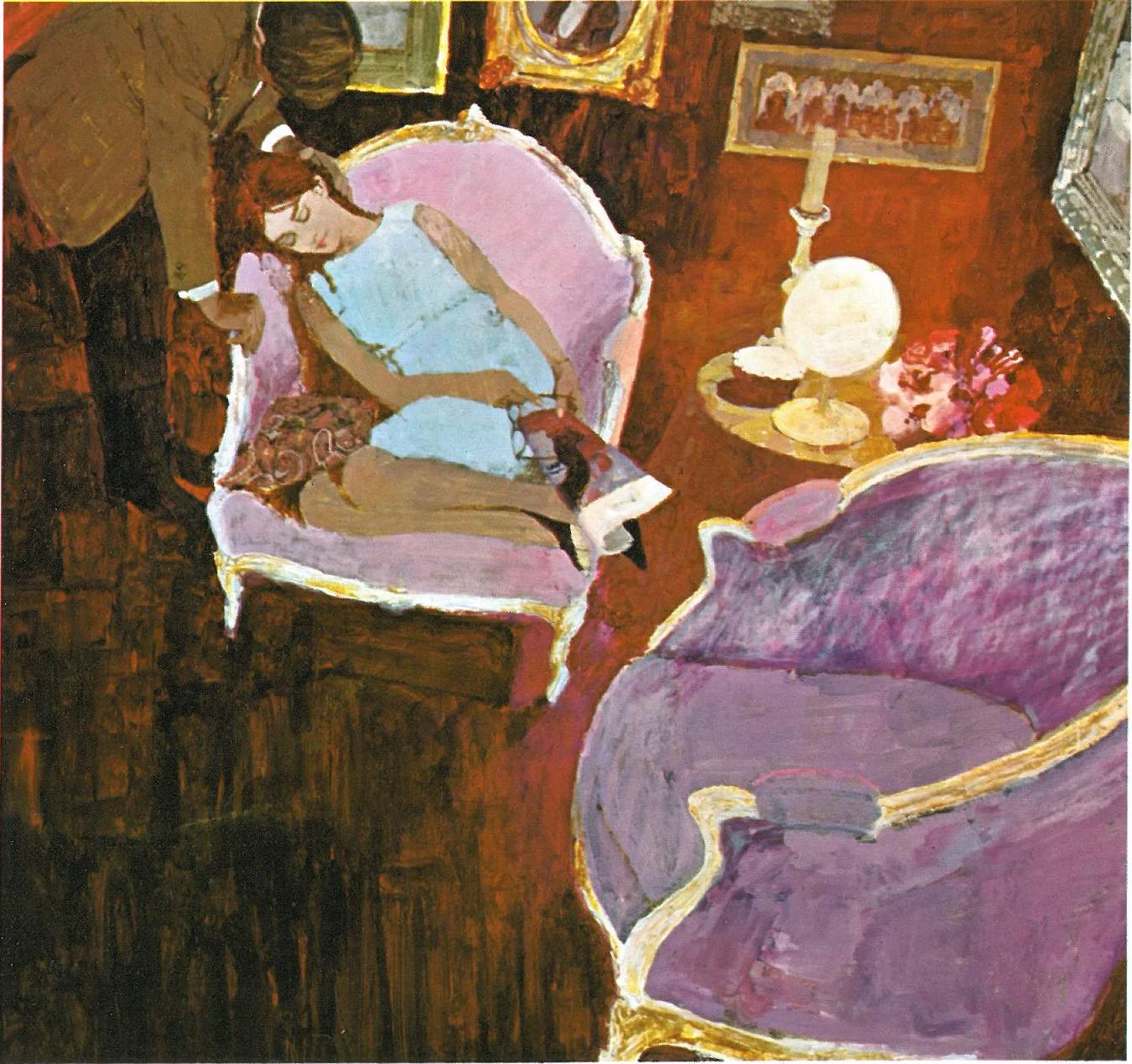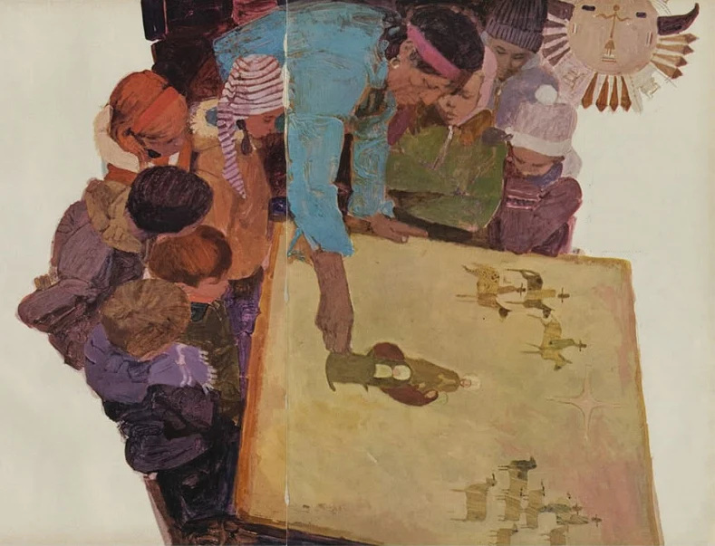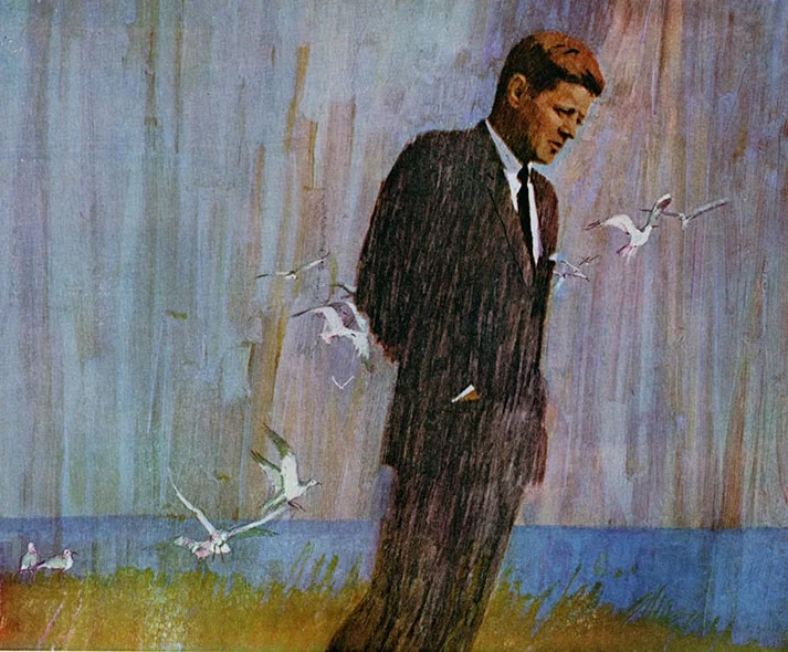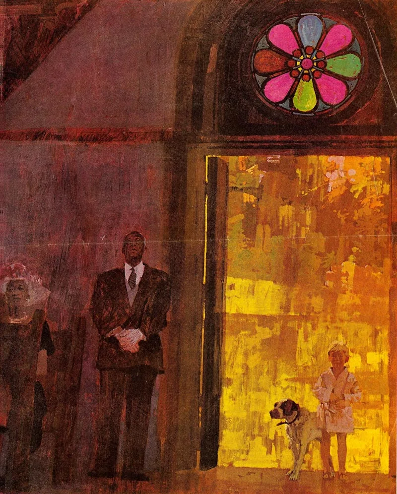 One vivid example, commissioned by McCall's magazine in the late 1950s, was a portrait of two young couples relaxing in a small room after dinner. One man is lying on the ground, his head nestled on a woman's lap and smoking a cigarette as she strokes his hair.