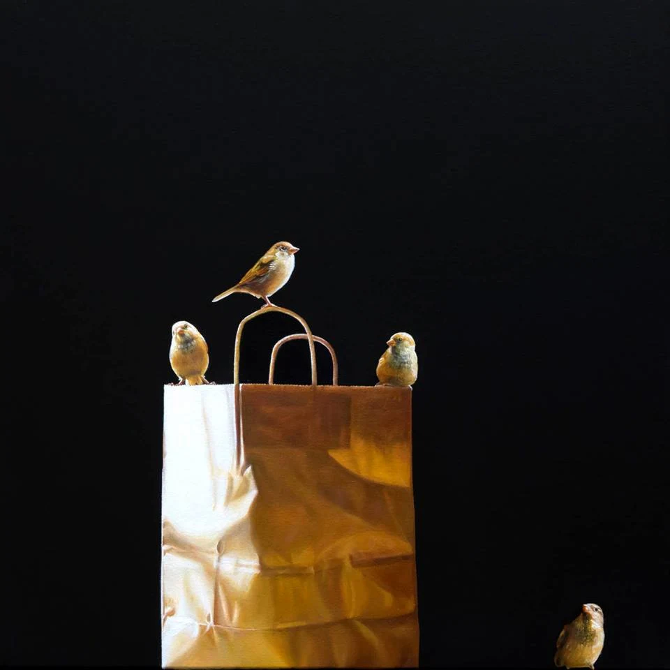 Referred to as "windowscapes", these works have become her signature style. Karen’s images vary from the whimsical (such as paintings with elephants) to the foreboding (such as paintings with crows).