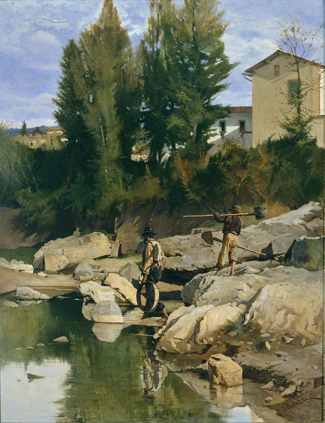 Nel paesaggio inserisce, a volte, la fatica dell'uomo, come nei Renaiuoli sul Mugnone del 1880 (Firenze, Gall. d'Arte Moderna), un dipinto impegnato, di "cronaca sociale", che non raggiunge la purezza mattutina di certe tavolette anteriori al 1870.
