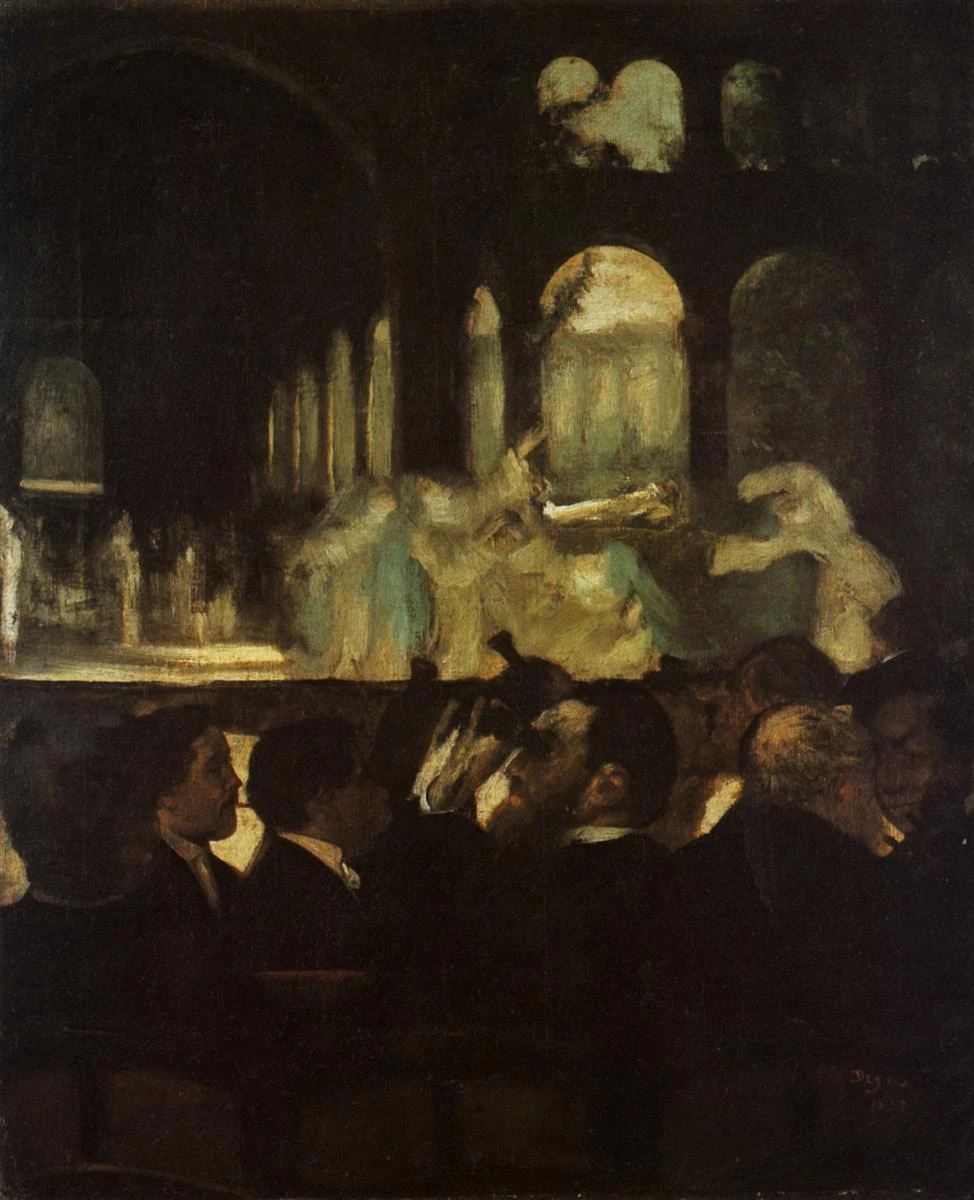 Blurring the distinction between portraiture and genre pieces, he painted his bassoonist friend, Désiré Dihau, in The Orchestra of the Opera (1868–69) as one of fourteen musicians in an orchestra pit, viewed as though by a member of the audience.