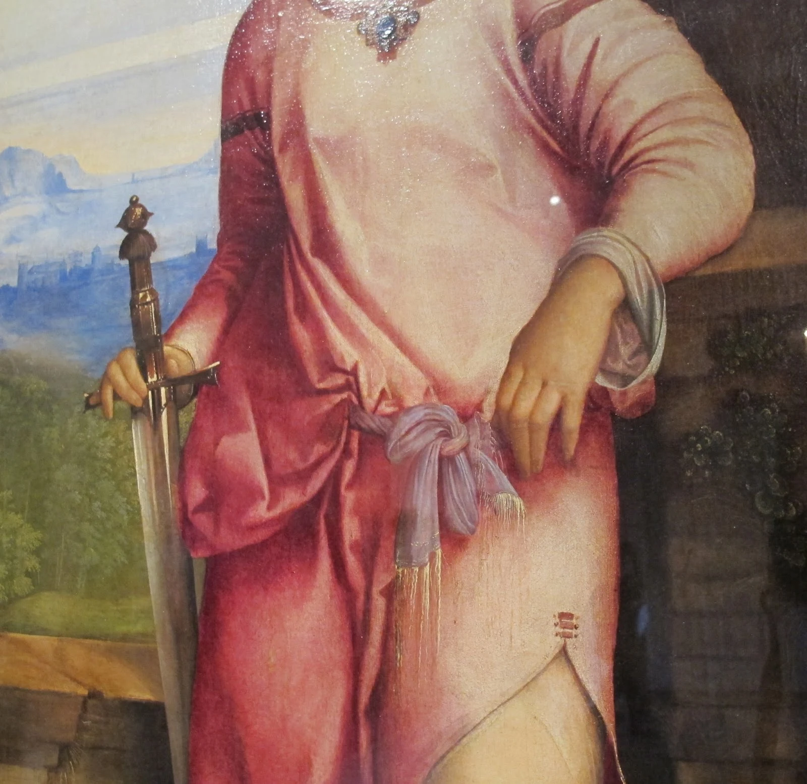 Sensuale è l'apparizione della gamba eburnea di Giuditta, dallo spacco della veste rosata che a sinistra si increspa in pieghette secche e ritmate, di ascendenza nordica. A un'ispirazione fiamminga rimanda anche il gioiello appuntato sul petto dell'eroina, sicuramente ispirato alle oreficerie coeve.