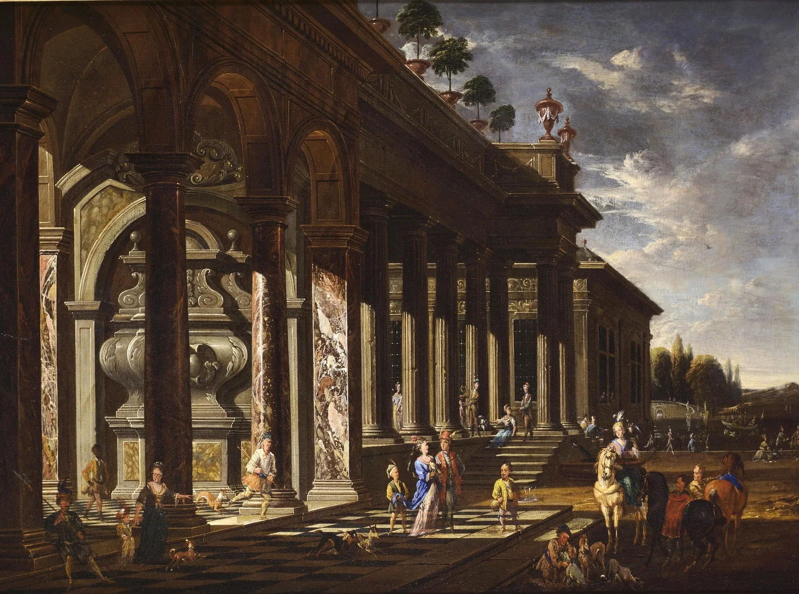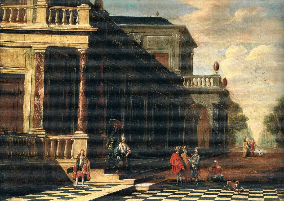 A good example of his imaginary architectural renderings is A Classical Portico with an Elegant Company Gathered by a Fountain (Auctioned by Sotheby's 27 January 2011, New York, lot 285). The composition depicts a monumental portico in front of which an elegant company is gathered. The sharp light cast on the building and the contrast between the pale sky and the contours of the portico suggest scale and volume. The inclusion of elements such as the peacock and page boy add a playful dimension to the painting.