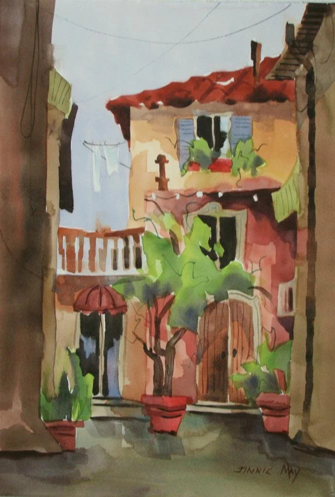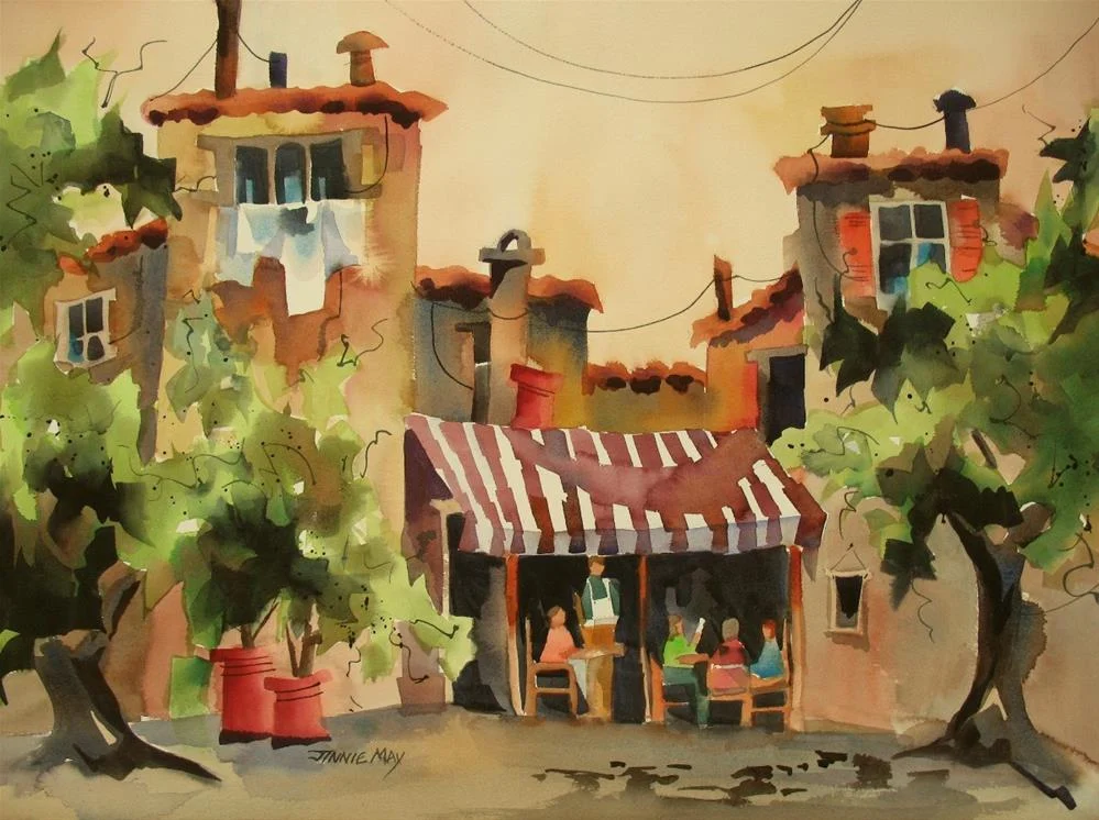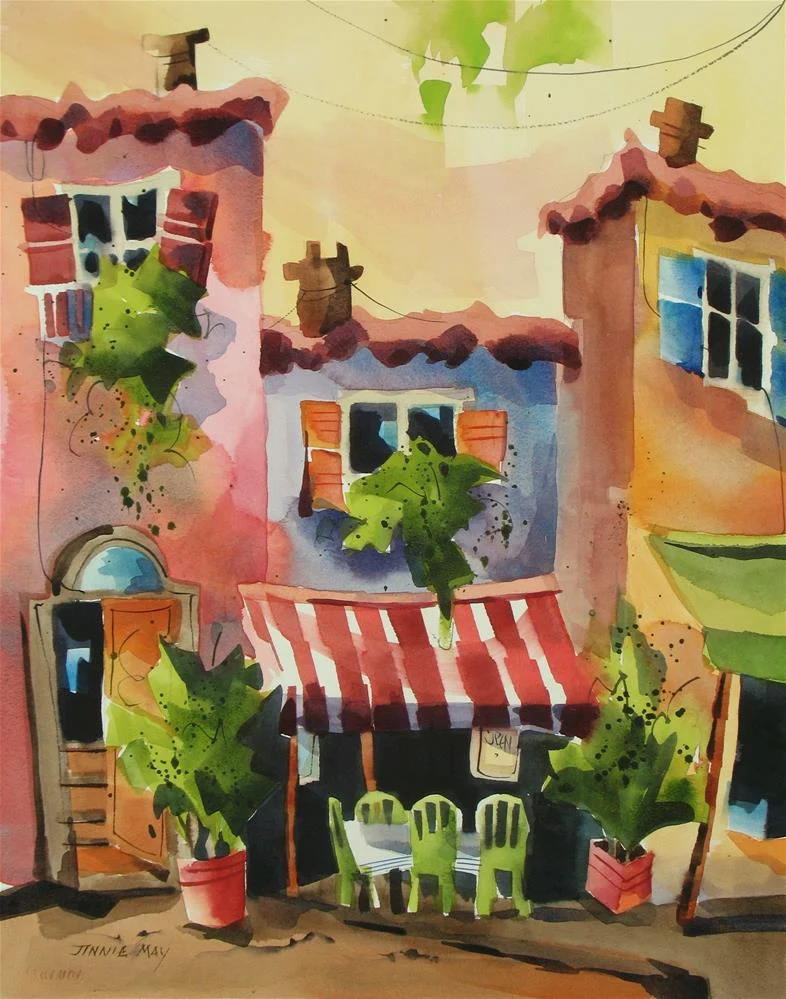 Jinnie May has always had an appreciation for art, but it wasn’t until she retired in 2000 that she began to seriously pursue art. Currently Jinnie is interested in the use of watercolor for its spontaneity, portability and indecisiveness. Her initial inspiration comes from studying California Watercolor artists from the 1940’s and 50’s, who painted genre paintings on large paper using big brushes and bold colors.