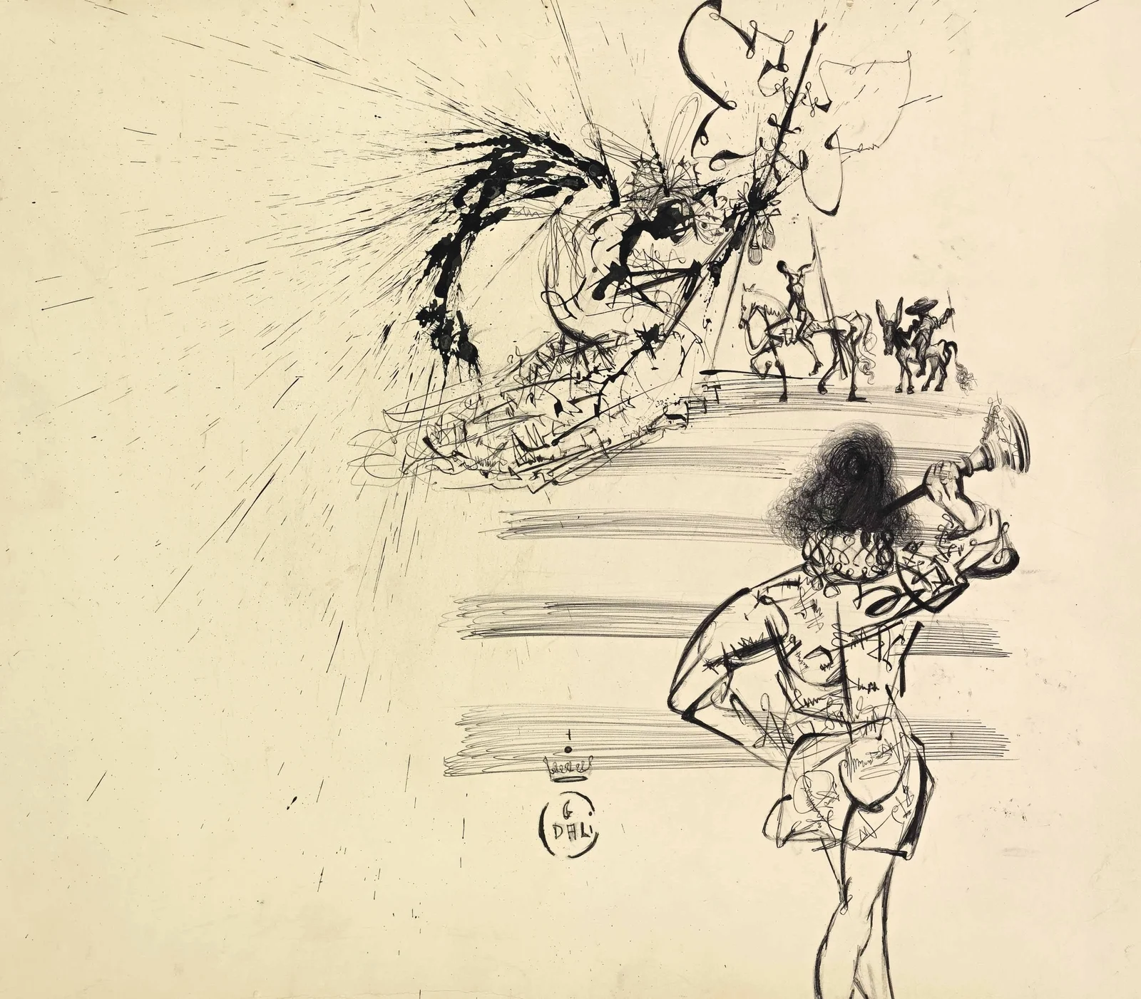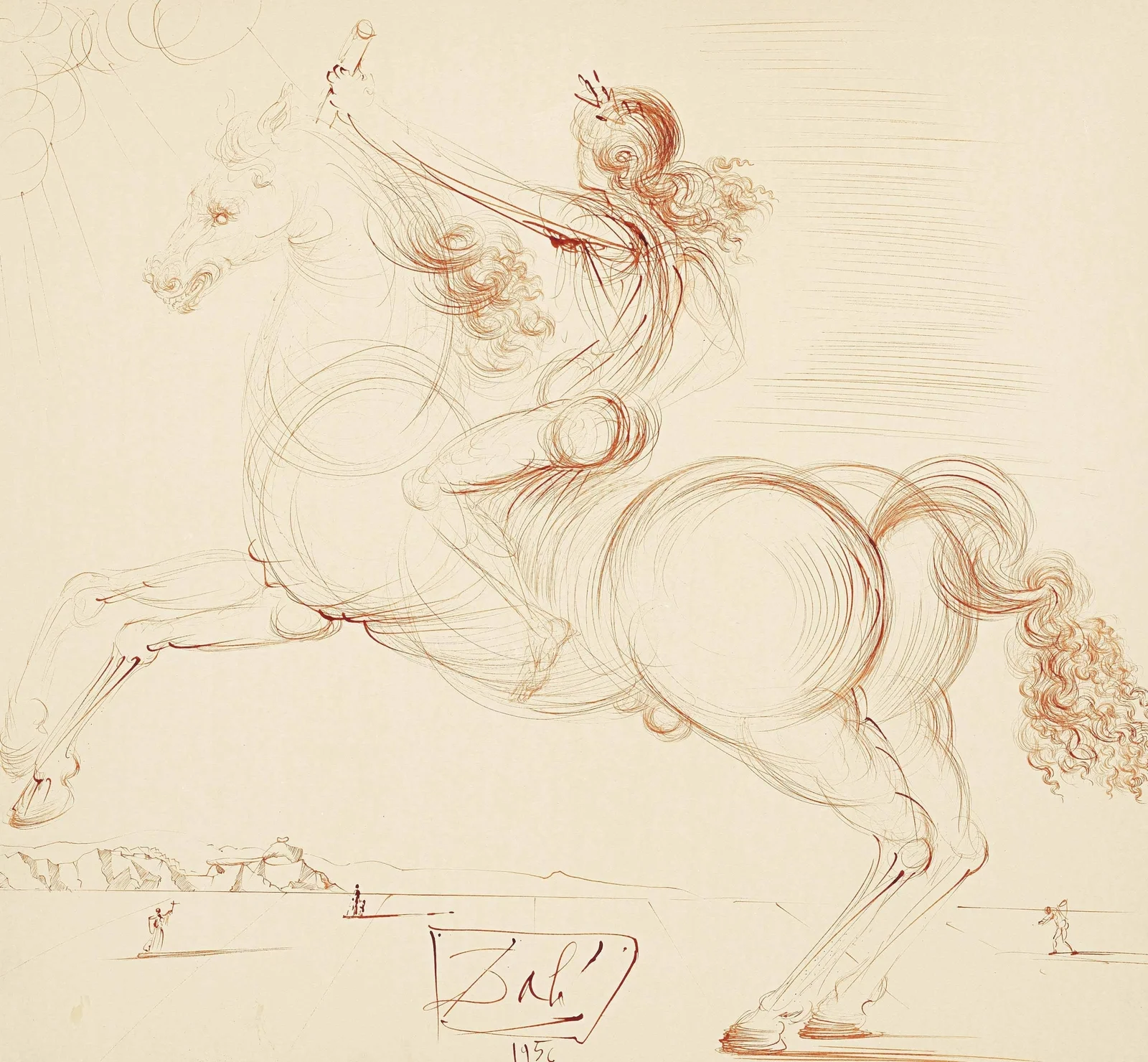 If Dalí was alive and you approached him to autograph a book of yours you would mostly likely get more than a signature, you would probably get a work of art. Dalí was famous for drawing his “autographs”. On the inside cover of hundreds of books Dalí personally dedicated many books to fans, friends, and business partners. In these drawings you see a repetition of some famous Dalí icons; ants, Don Quixote, Horsemen, Angels and the Dalinian landscape. Dalí probably used these because he was extremely comfortable drawing these quickly and he wanted his admires to be left with something of great quality and style.