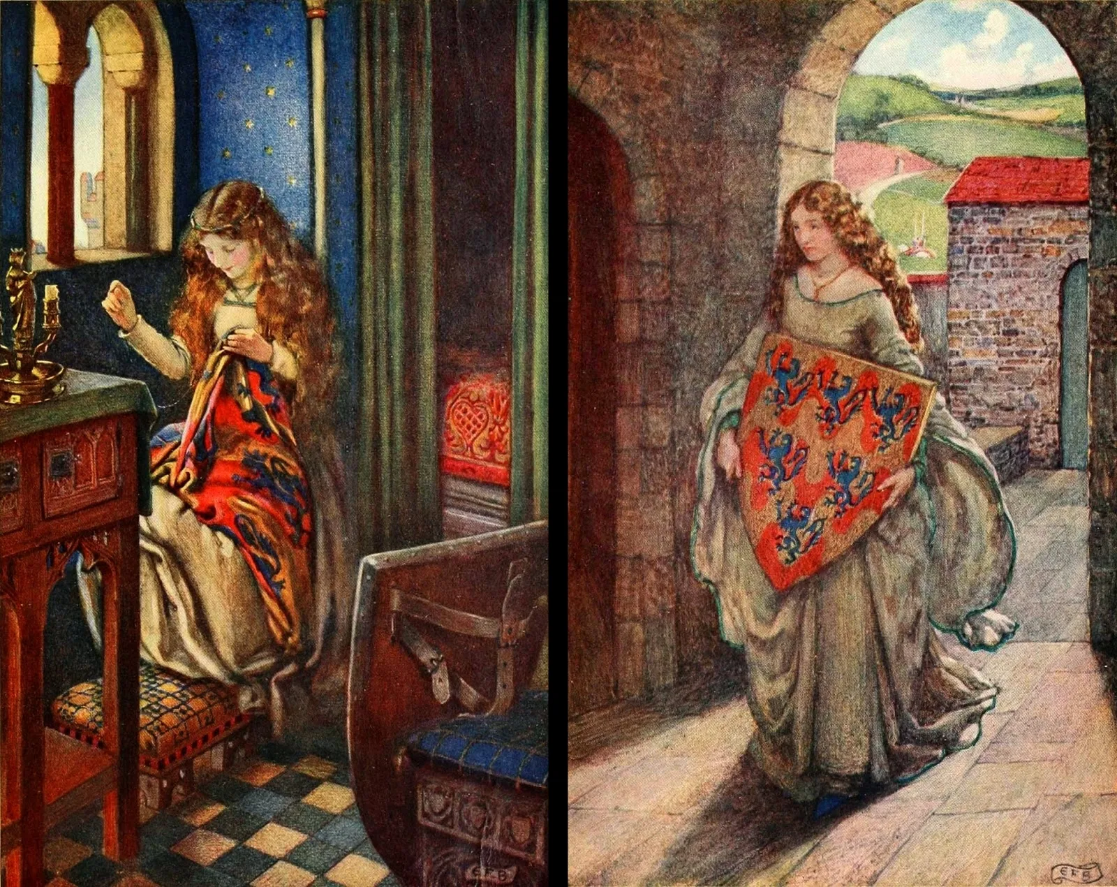 Nel 1909, Ernest Brown delle gallerie Leicester, commissionò alla Eleanor Fortescue-Brickdale una serie di 28 illustrazioni ad acquerello di Tennyson's Idylls of the King, per i quali lavorò più di due anni. La serie venne esposta in galleria nel 1911, mentre 24 di loro sono stati pubblicati l'anno successivo in una edizione deluxe dei first four Idylls.