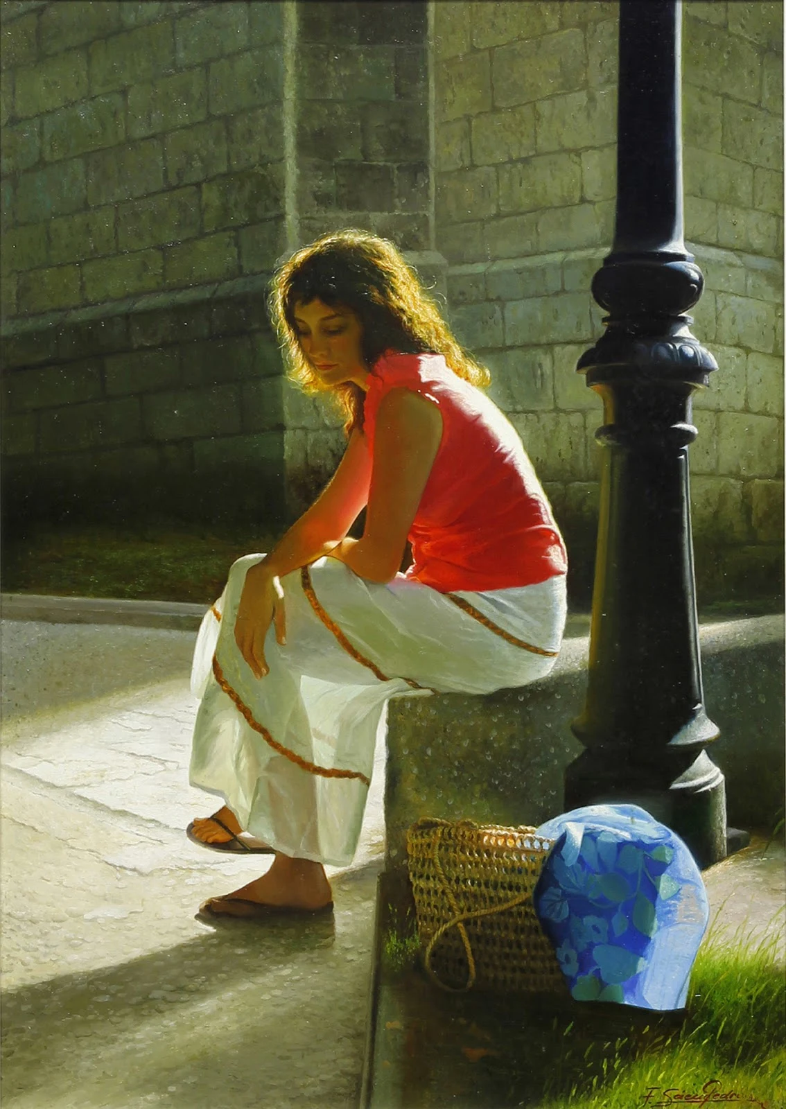 Pedrosa’s skill as a hyperrealist is unmatched. Like an architect, he buildsa scene with the foundations of drawing, and from that adds color to bringhis forms to life, without revealing the painter’s brush-stroke. He is anartist who knows how to capture human expression and emotion in themost natural way. Like a photograph, the viewer is able to capture aglimpse of a moment as if the world was standing still. Pedrosa is gifted in creating detail. His beautiful shadows bring dimension to his forms with an