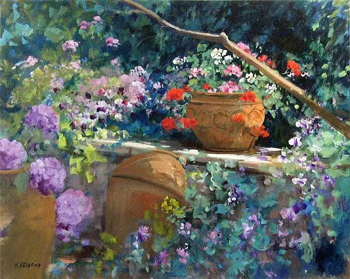 In Serafrina's gardens, sharp shafts of shadow and sunlight weave an arabesque tapestry in which foliage, flowers, light and shadow interplay and mingle. The viewer is thus led into a mysterious enclosure in which space and limits are never fully disclosed, but only suggested. Her intent is for the viewers to be embraced within this enclosure and to find themselves refreshed and restored.