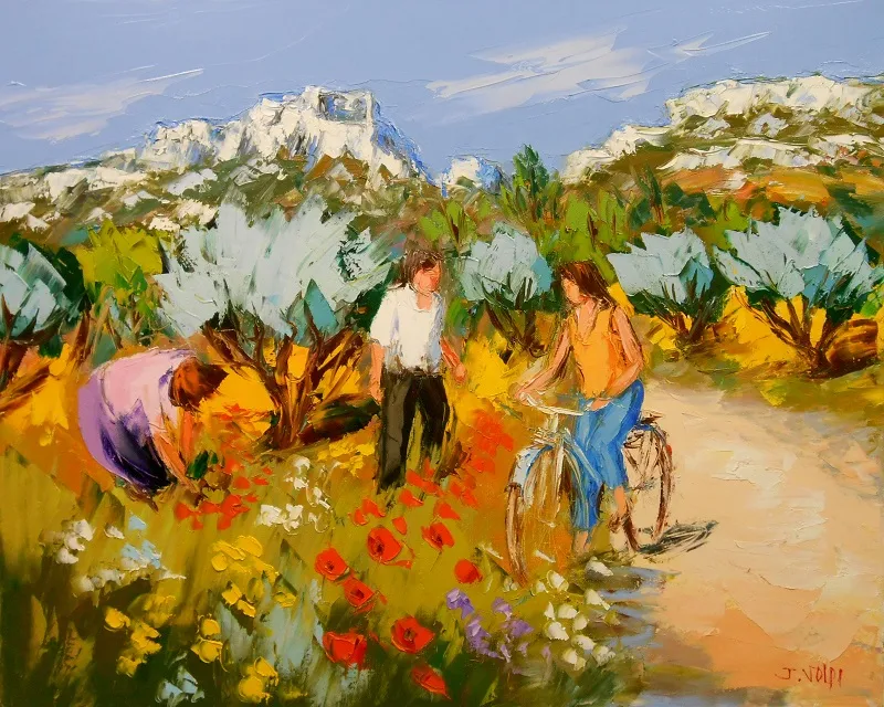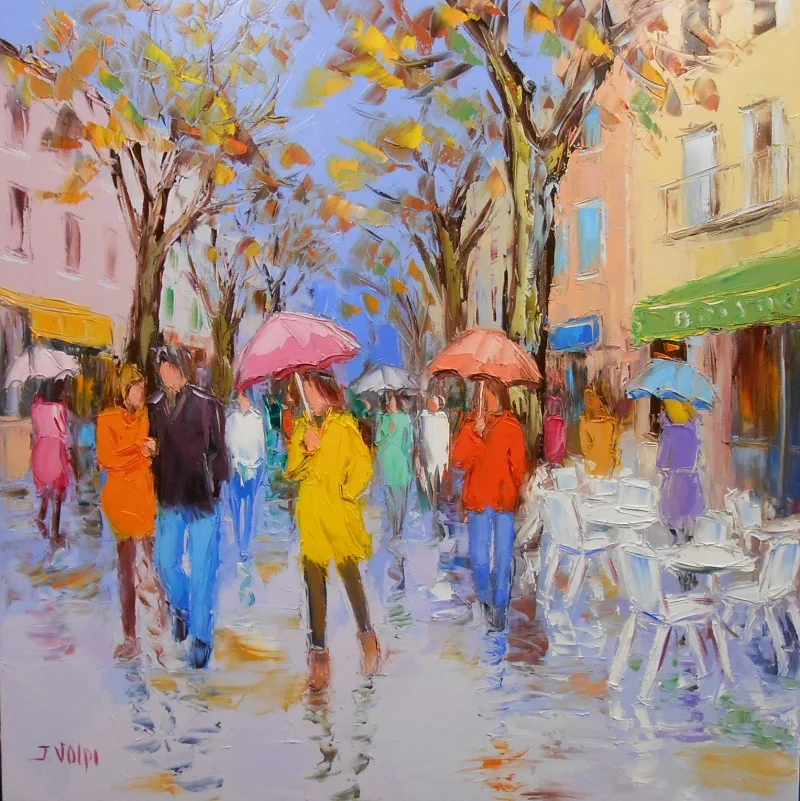 He paints by using the technique of the "knife". The subjects are animated by persons, the colours are lively. It is famous for his persons in the rain of noon of France. He exposes internationally and the works are a part of prestigious collections all over the world.