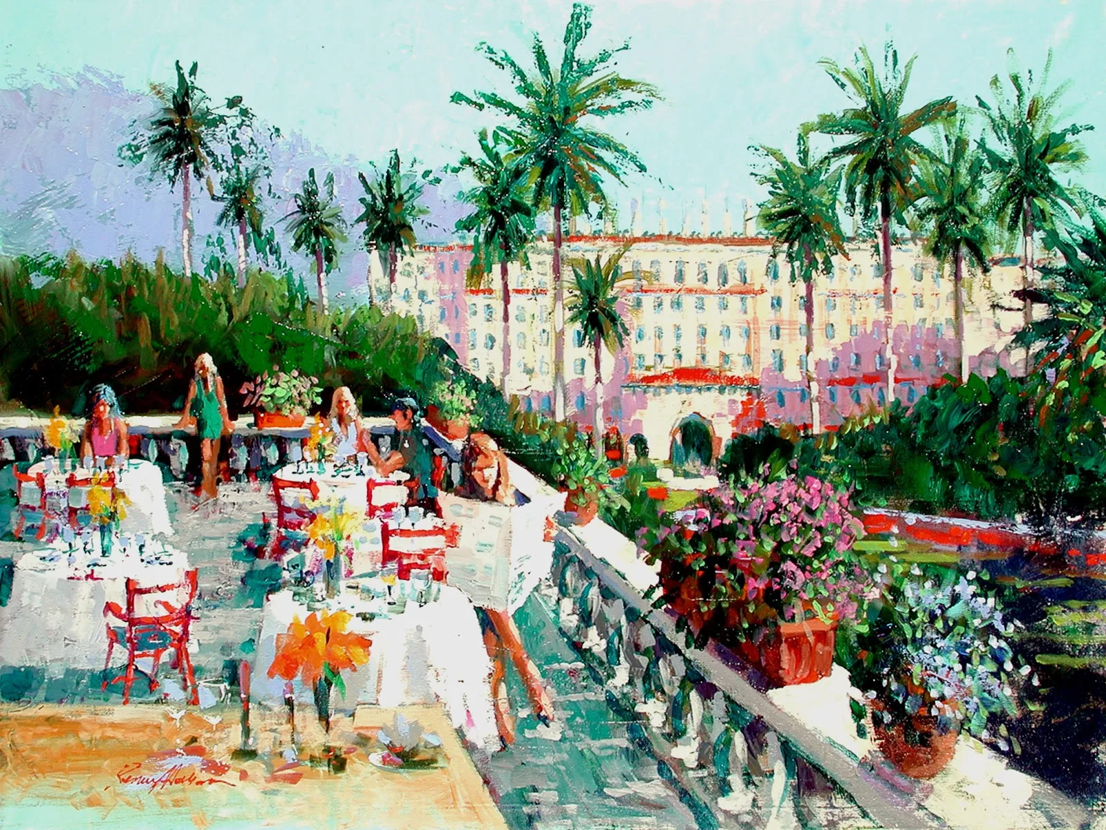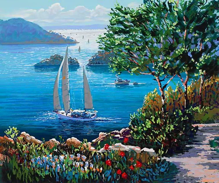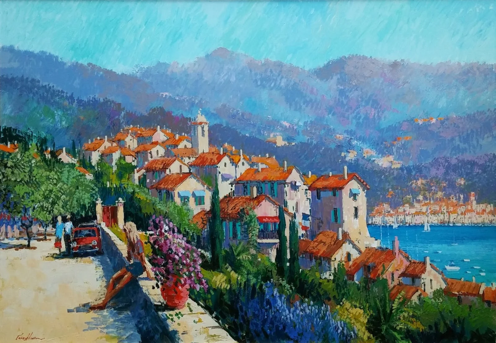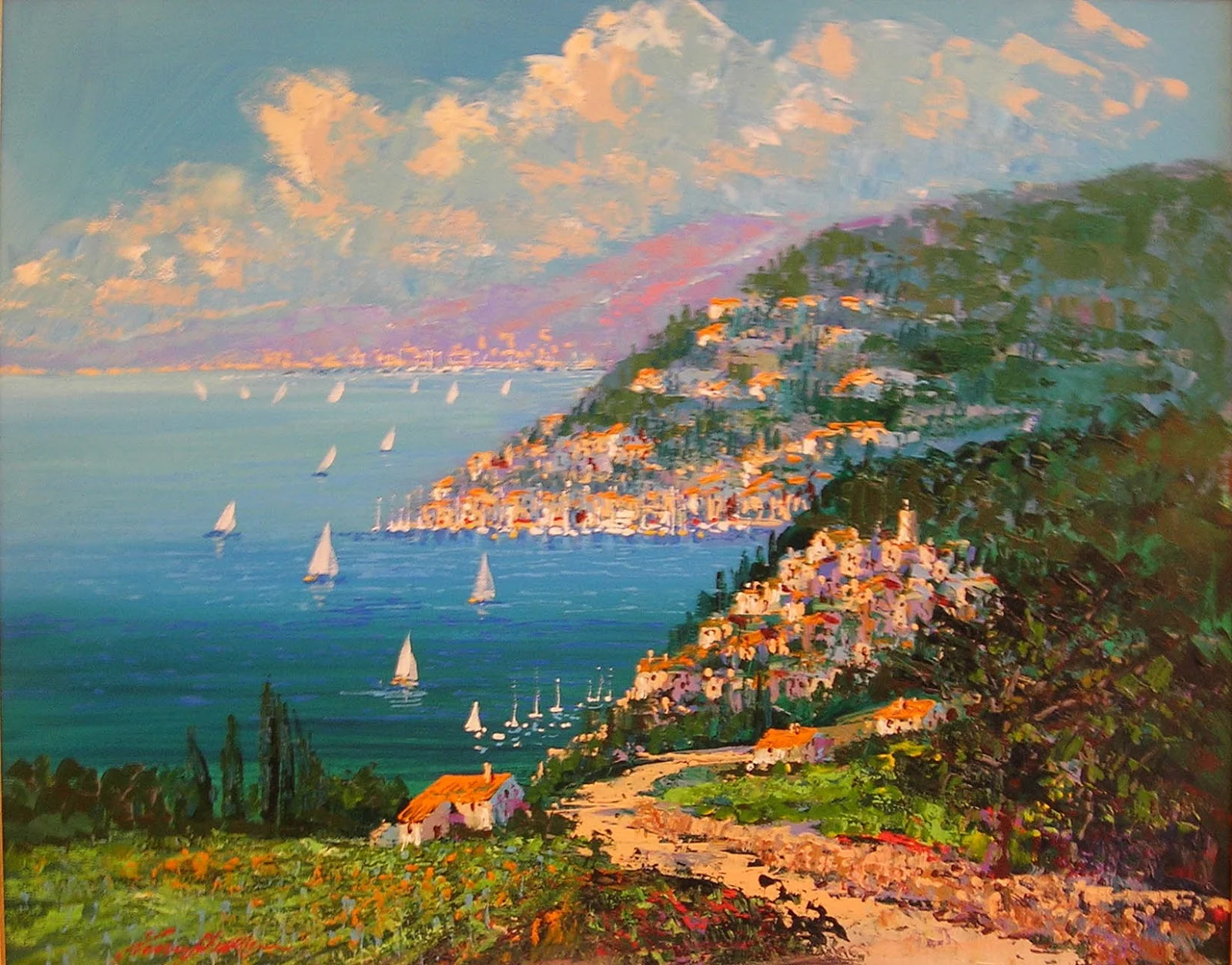 Inspired by the Fauves, Hallam has a love for the 19th century French Post-Impressionists, Cézanne and Van Gogh. Hallam returns frequently to St. Tropez and the French Riviera, two of his favourite sources of inspiration. Noted for his striking colour harmonies, Hallam's panoramas continue to draw accolades, including a first place award by L’Association Pour le Promotion Artistique Francais. His work has been featured in a large number of print articles, such as the October 400 issue of Forbes magazine in 1999 as well as in PBS television specials. Chalk & Vermilion Fine Arts and Martin Lawrence Galleries are Hallam's most notable publishers.