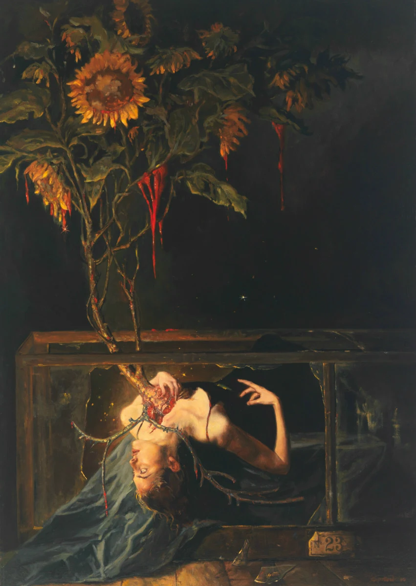 Le donne al centro di questi scenari, dall’aspetto romantico e dai lineamenti languidi, completano il fascino grottesco di queste opere tardive, eppure puntualissime.
