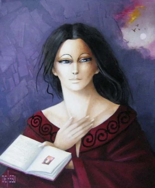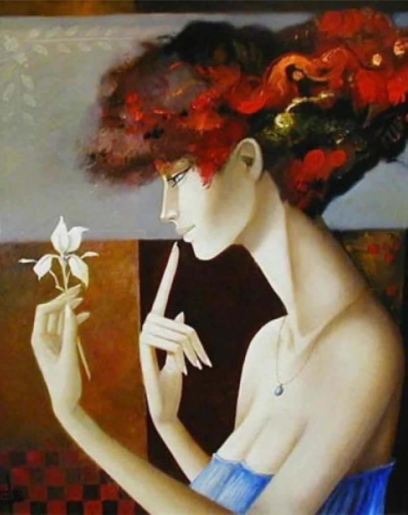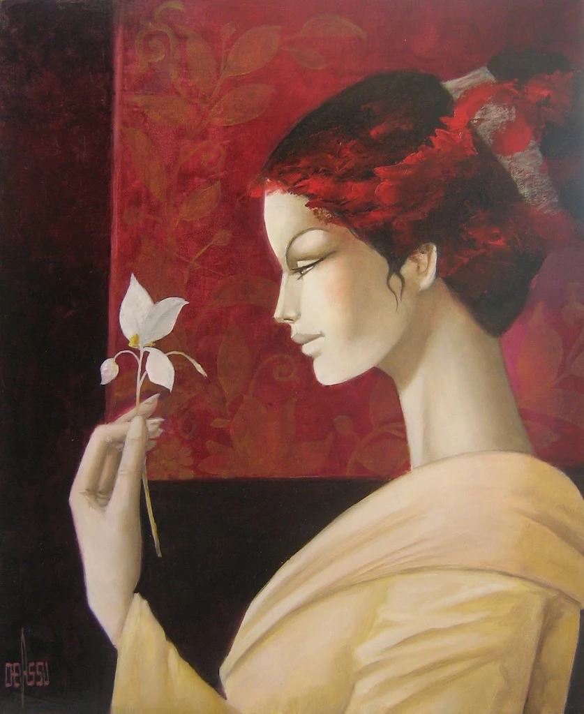 He paints portraits of women, symbolizing them in a thousand ways, but always with fine faces and striking beauty. His rich, elegant and enigmatic paintings have won him several first prizes as well as great admiration from art lovers.
