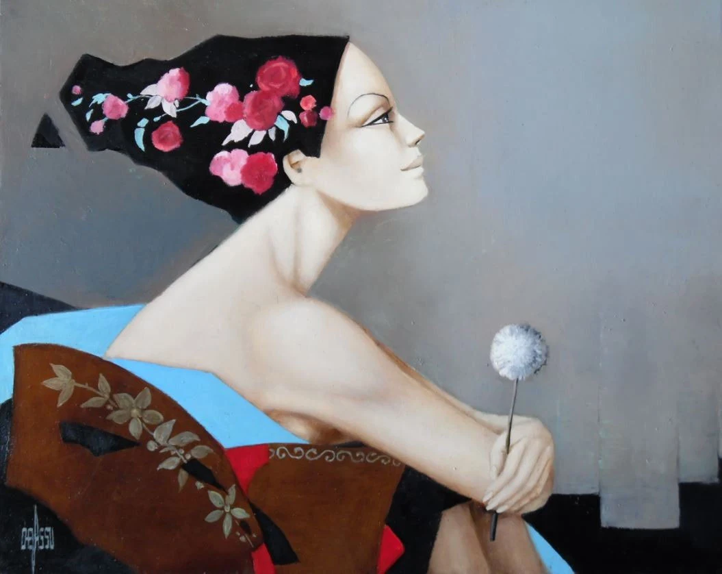 Pierre Chevassu has a personal way of representing women a symbolic subjects. The smoothness of their faces their sweetness, often reflecting beautiful eyes, neat hair, all worked in a colourful way, giving Chevassu paintings an elegance and great gentleness.