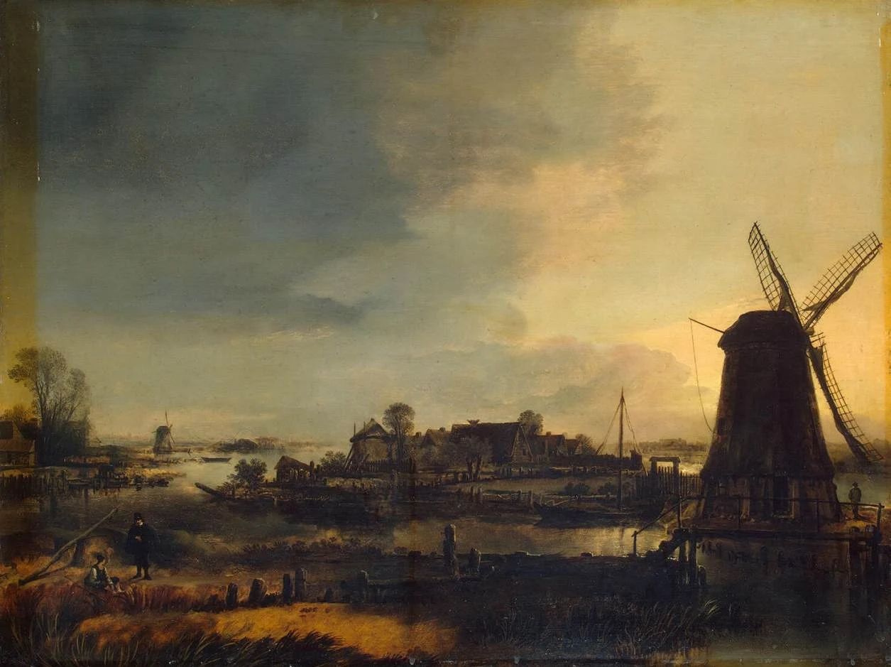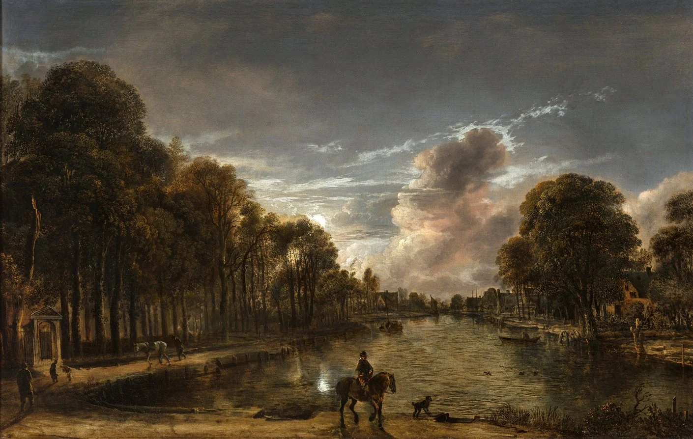 Apart from a number of accomplished winter scenes-such as View of the River in Winter in the manner of Hendrik Avercamp (1585-1634), who was among the first northern Dutch painters of winter scenes-van der Neer specialized in canal and river landscapes seen by the light of sunset or early dawn or-most characteristic of all-by moonlight, as in River Scene by Moonlight. Within this somewhat limited range, van der Neer had no rival among his contemporaries. His sensitive handling of subdued light and its reflections on water and in the windows of riverside houses is unequaled. Scholars agree that he was at the height of his powers from the mid-1640s to about 1660.