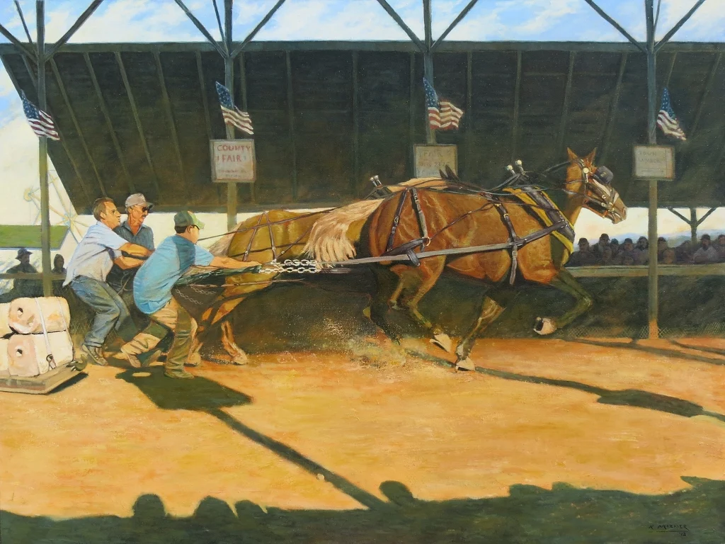 Kevin takes advantage of the everyday beauty of Maine: The Lobstermen plying their trade along the coast, or the rolling fields, farms and woods of Maine's interior. In his Americana paintings, he evokes a sense of the working people of Maine's history. All are given a bold color-filled look that typifies Kevin's paintings.