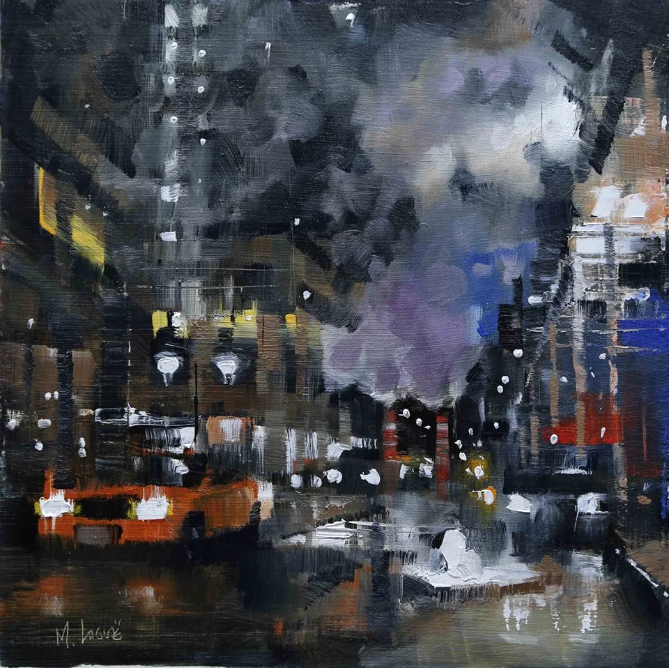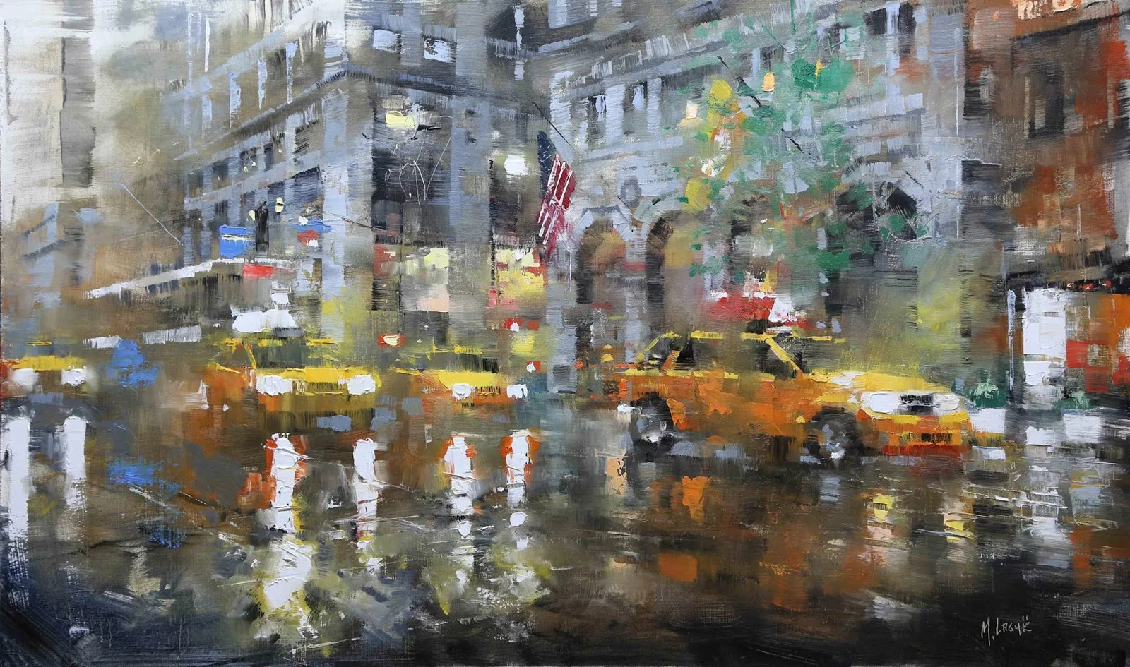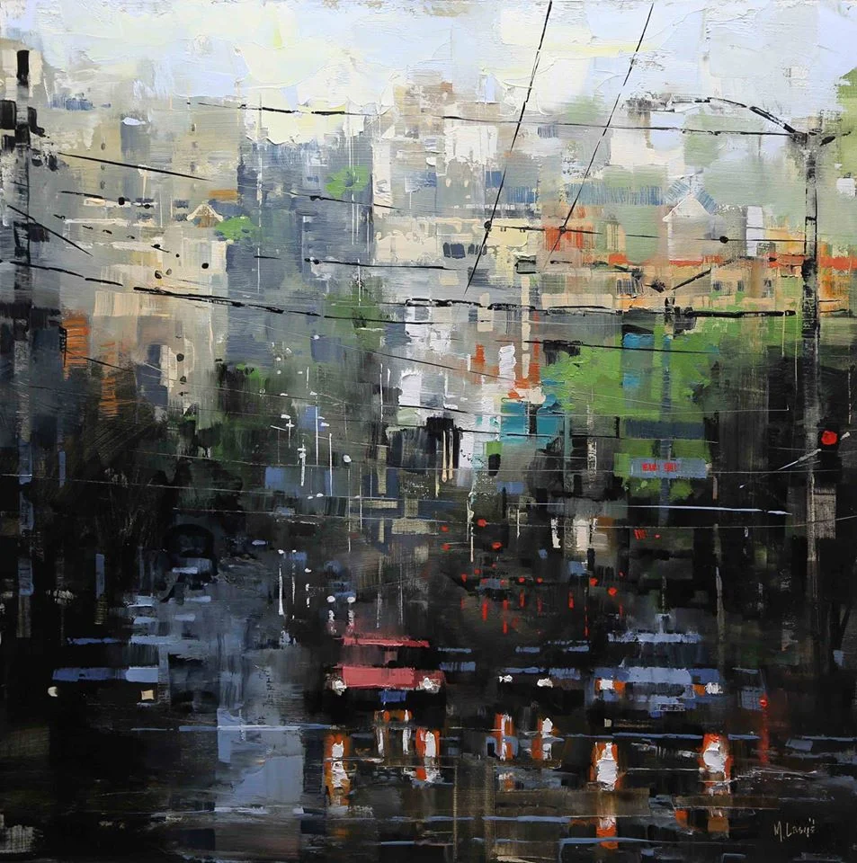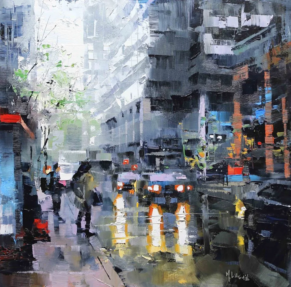 Gli spettatori rimangono affascinati dalle emozionanti pennellate di questo artista, dai riflessi delle luci della città di notte e delle strade bagnate nelle giornate piovose.