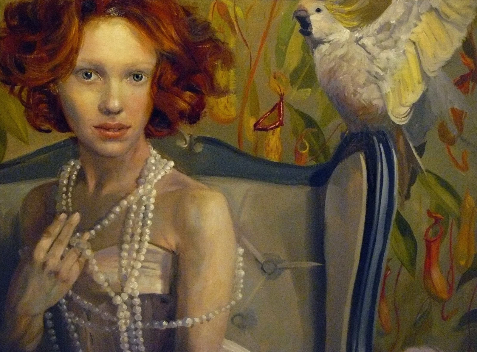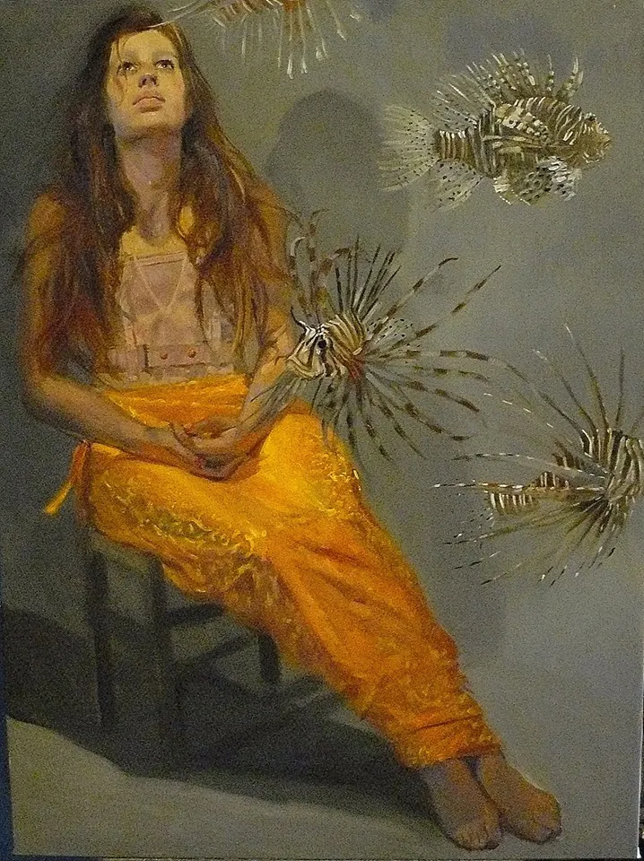 The tales and Sophie Morisse’s paint got married and lived hapilly ever after … Here is a happier outcome! Tom Thumb, Donkey Skin of Perrault, The lLittle Mermaid of Andersen, Alice in Wonderland of Carroll … So many stories which inspire the rouennaise artist and engender atypical paintings. The imagination of the tale, at the same time magic and disturbing, shows through her character. We do not know if we have to be afraid of the crazy Hatter or laugh; we admire dresses of Donkey Skin as much as we are afraid of the consequences if she wear it … This dichotomy is present in all her work. We also find her in the use of brilliant but terrible animals especially when groups: batrachians, butterflies, dragonflies, birds … The immediate entourage of the artist, friends, family, gladly enter into the spirit of the game of the pose. The model returning most of the time is her 12-year-old daughter, Thaïs. "I do not want to paint her portrait in particular, but rather to represent the childhood generally, and more widely the human face, two essential components of my work".