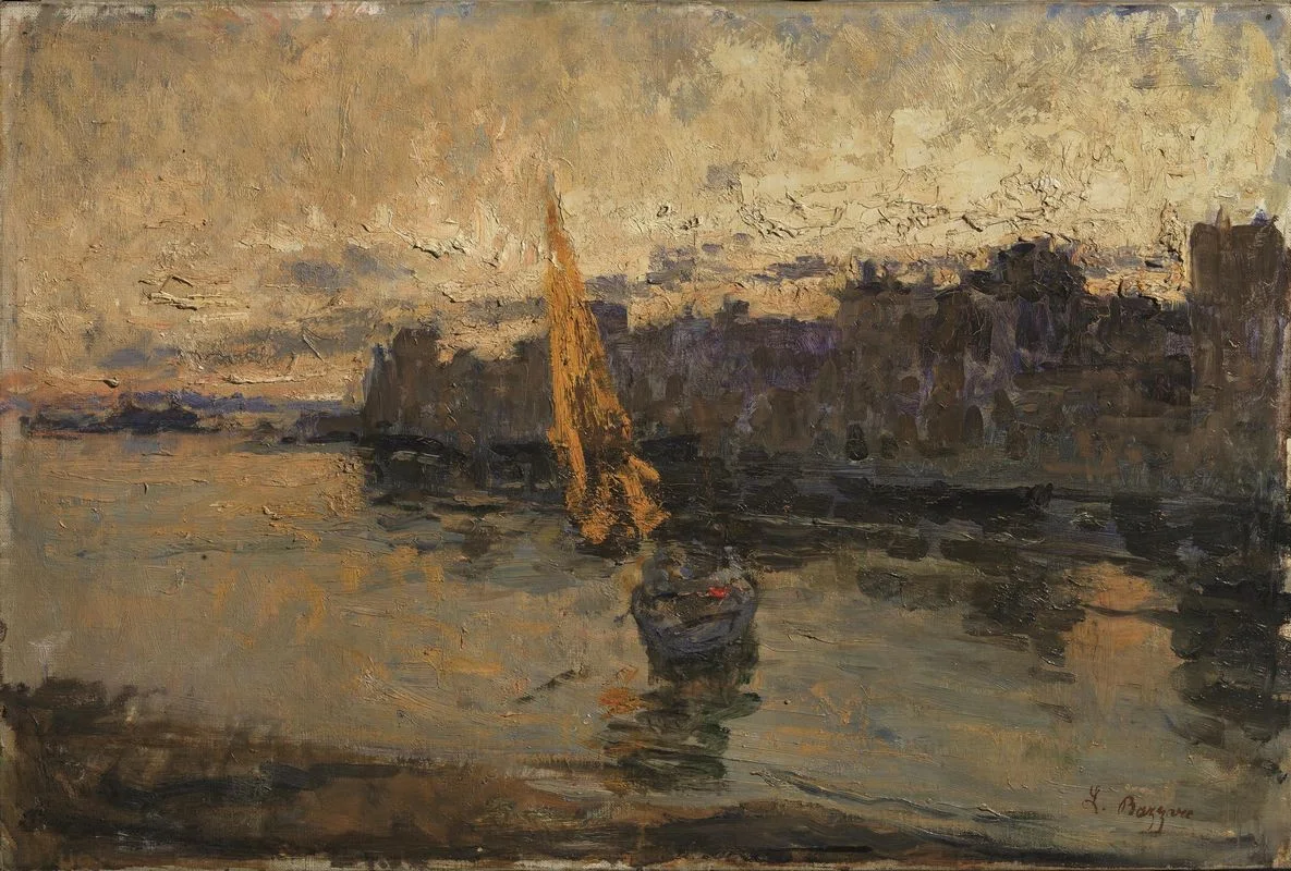 In this painting, as in Peace to the Shipwrecked, Bazzaro depicts two young widows weeping for their drowned husbands against a lagoon-scape depicted with the consummate skill that made him one of the leading exponents of Lombard Naturalism.