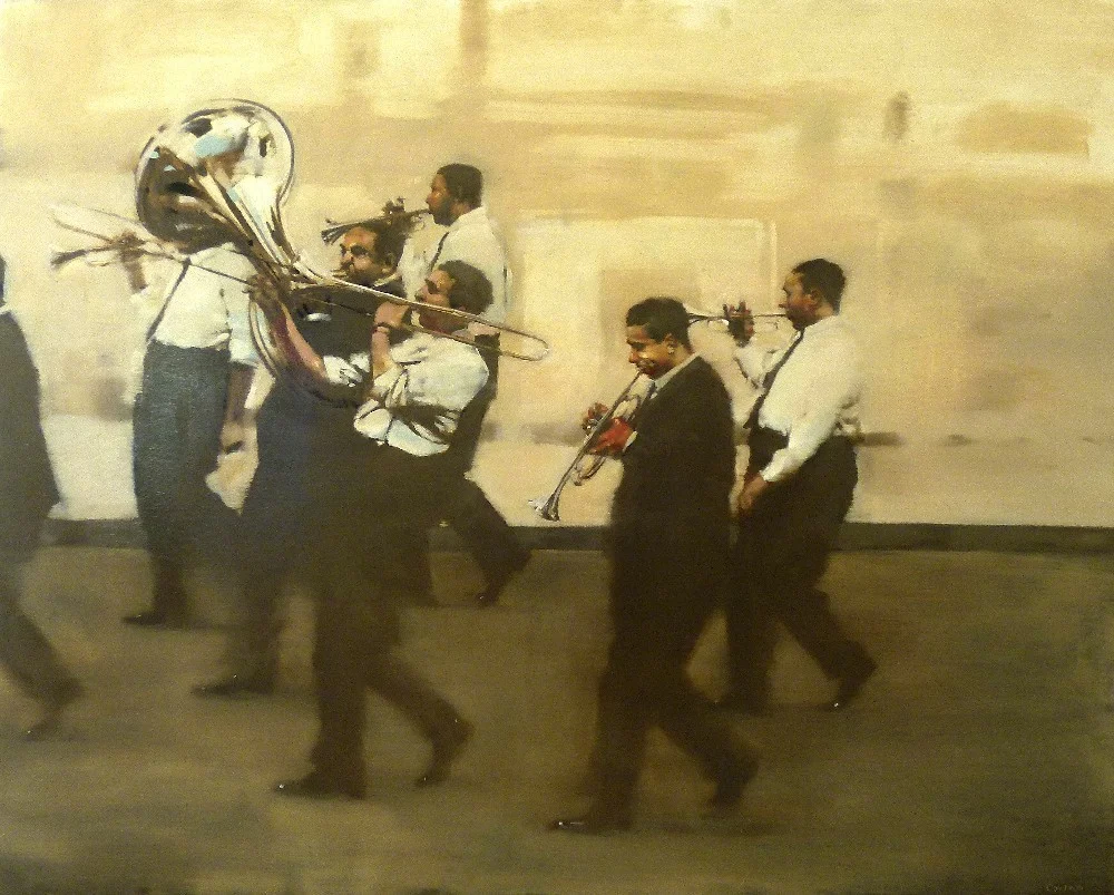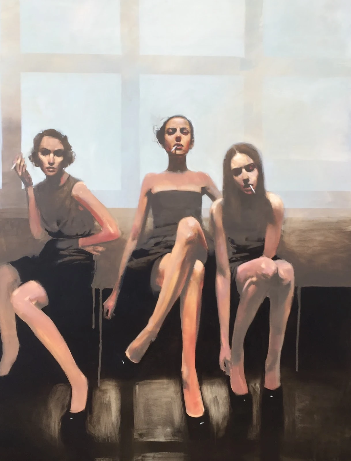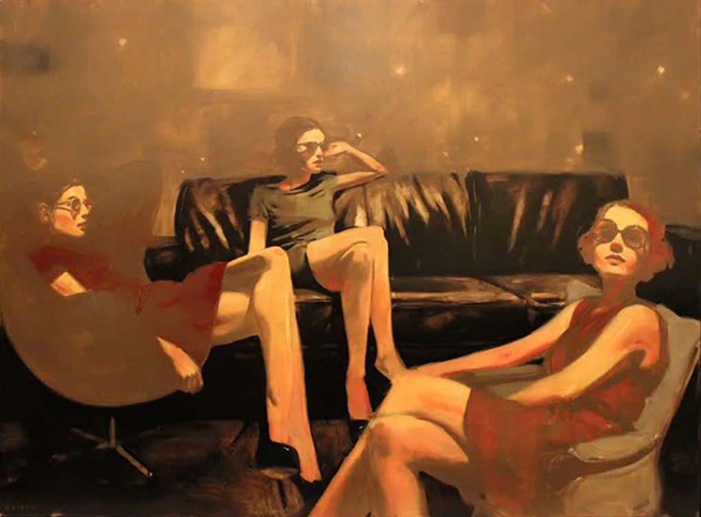 His figures usually find themselves in bars, nightclubs, cafes, and jazz clubs; even at home in intimate settings.