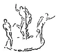 Colui che col trarre vuol ficcare o trarre il calmone in terra, alza la gamba opposita al braccio che trae, e quella piega nel ginocchio; e questo fa per bilicarsi sopra il piede che posa in terra, senza il qual piegamento o storcimento di gamba far non si potrebbe, né potrebbe trarre, se tal gamba non si distendesse.