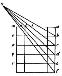 Dimostrasi: essendo l'occhio n al quale concorrono le cinque specie delle cinque parti della torre af, cioè abcdef, dico che se l'aria fosse d'uniforme grossezza, tal proporzione avrebbe la partecipazione del colore dell'aria che acquista il piè della torre, f, con la partecipazione del colore dell'aria che acquista la parte della torre b, quale è la proporzione che ha la lunghezza della linea fm con la linea bs. Ma per la passata, che prova l'aria non essere uniforme nella sua grossezza, ma tanto piú grossa quanto essa è piú bassa, egli è necessario che la proporzione de' colori in che l'aria tinge di sé le parti della torre b ed f sieno di maggior proporzione che la proporzione sopradetta, conciossiaché la linea mf, oltre all'essere piú lunga che la linea sb, passa per l'aria, che ha grossezza uniformemente disforme.